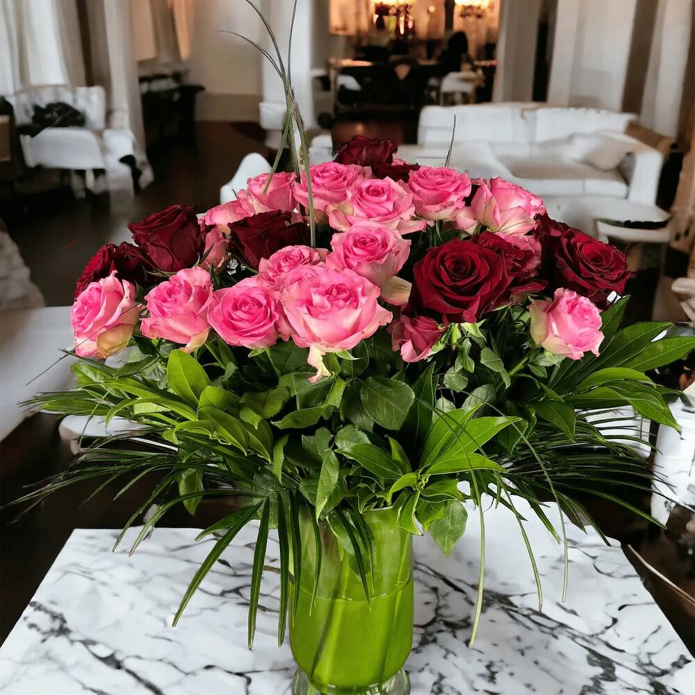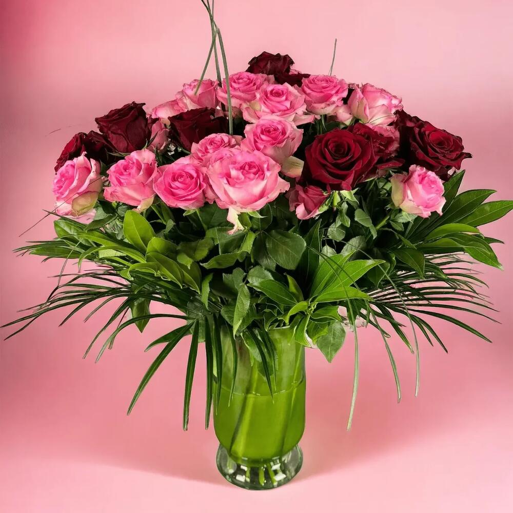 This vase bouquet is a mix of 24 pink and 24 red roses, making 48 roses in total. It’s great for special days like Birthdays or Mother’s Day. The roses are carefully chosen and displayed in a vase, making it a special way to show love, gratitude, or celebrate something. What’s inside: 24 Long stem pink roses 24 Long stem red roses A vase