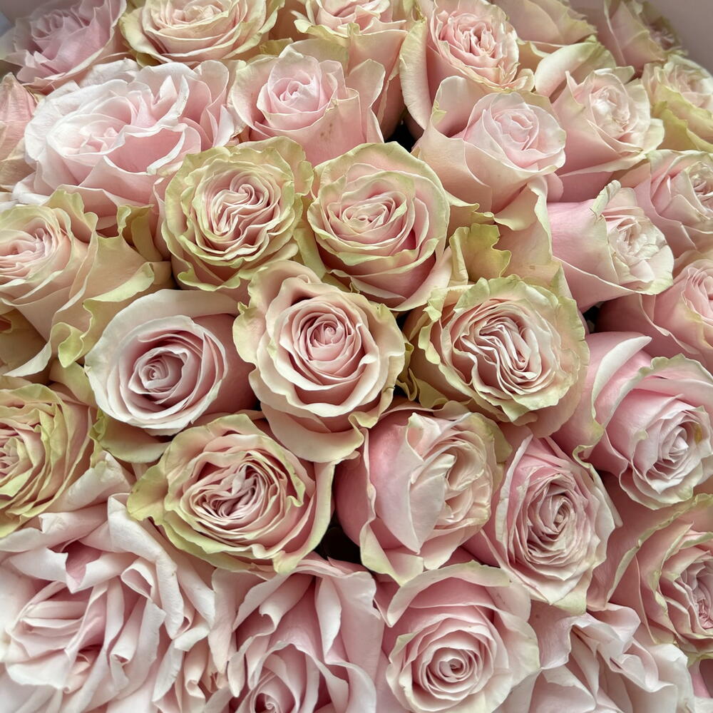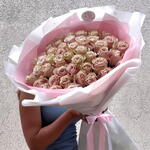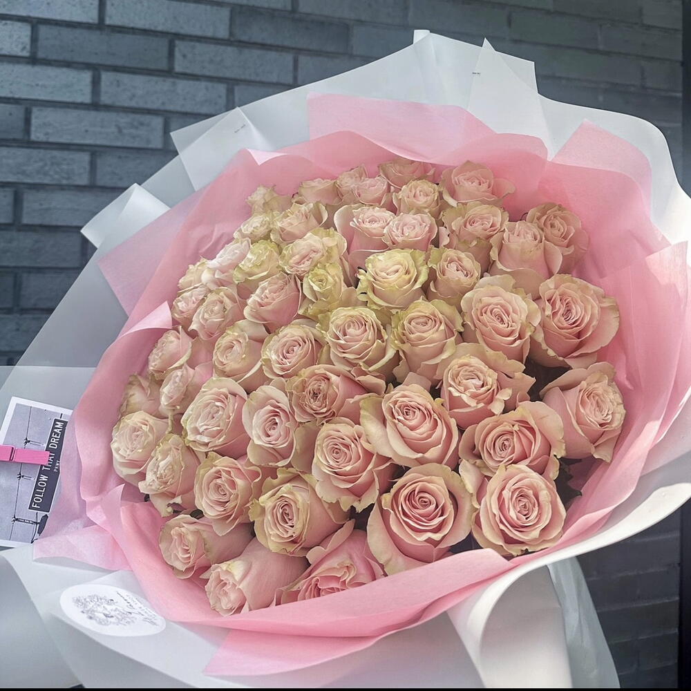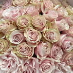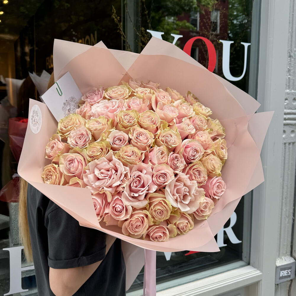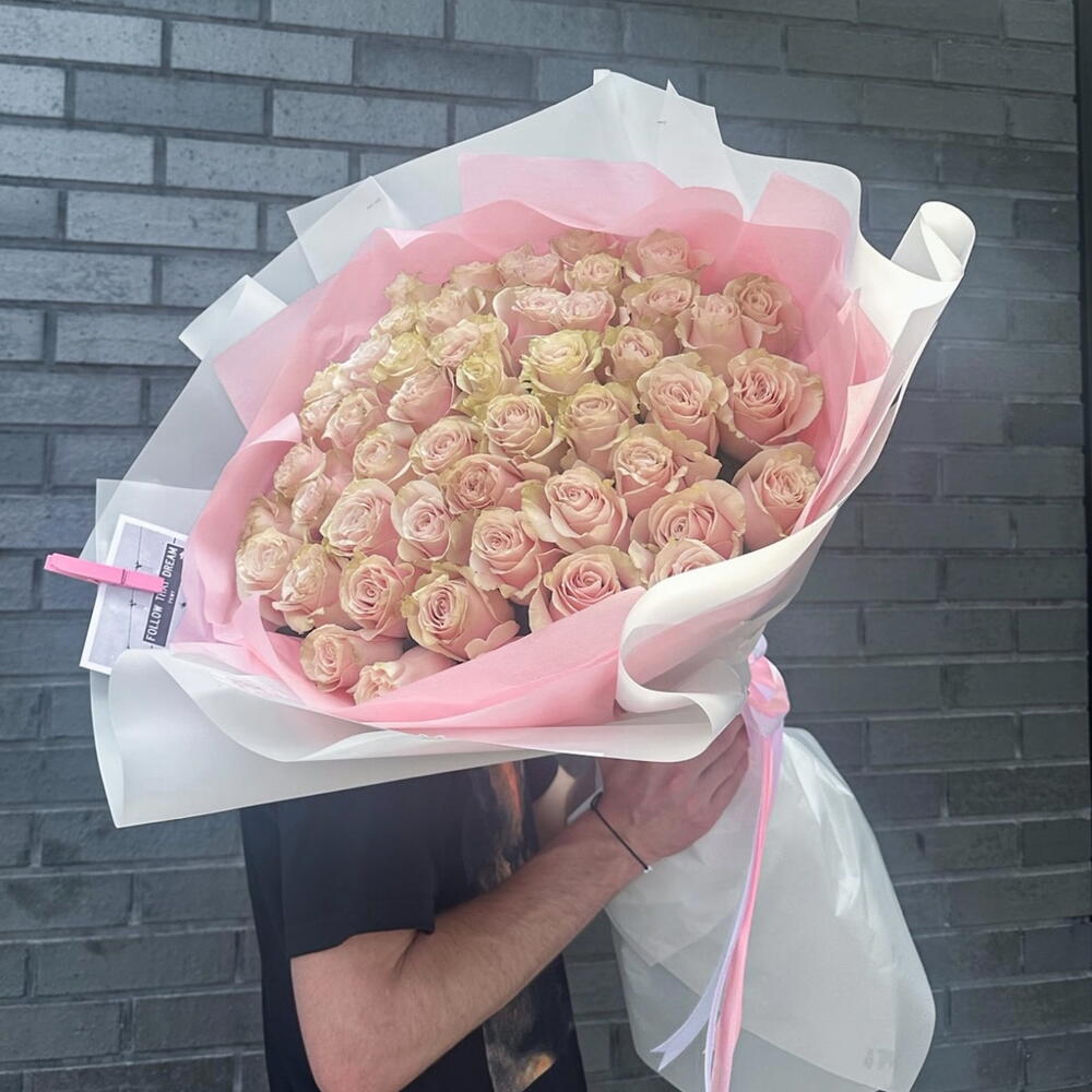 Monobouquet of premium Pink Mondial roses, the petals of which have an unusual color - from pink to cream. Reminiscent of delicious cakes or sweet creamy caramels, they will appeal to absolutely everyone. Perfect roses are packed in perfect translucent paper, which emphasizes their extraordinary color. Since all flowers are individual, just like people, the bouquet may be slightly different. But we try to repeat each bouquet as much as possible, as on the photo in the product card. Add to favorite to not lose! HOW TO CARE OF FLOWERS? Do not remove the wrapping paper from the bouquet, so then flowers will live longer Change the cold water in a vase every day Keep the vase clean Cut the stem of each flower every two days Keep the bouquet out of a direct sun, drafts and heaters Add the flower food 2-3 days after you’ve bought your bouquet (We add the flower food to every bouquet)