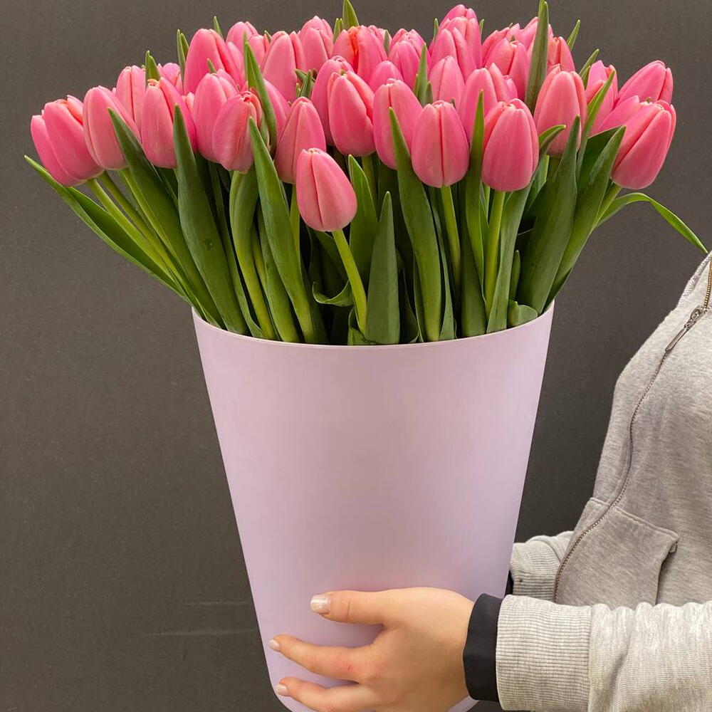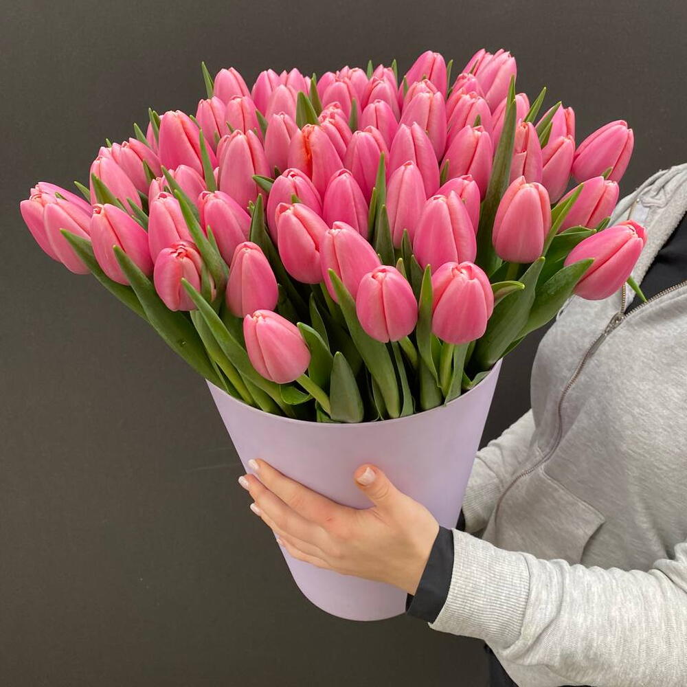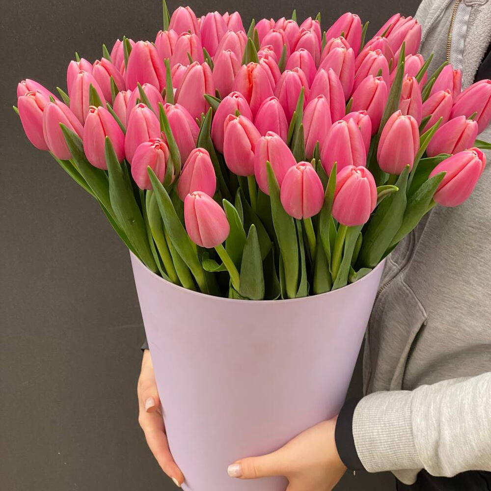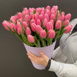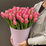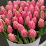 A beautiful bouquet in a pink vase. It consists exclusively of pink tulips.