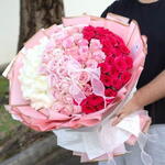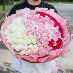 Unveil the world of floral elegance with our enchanting Mono Bouquet, meticulously curated to perfection. Comprising 30 tender light pink roses, 20 pristine white roses, and 25 vivacious deep pink fuchsia roses, this bouquet is a symphony of colors and aroma. Each flower is carefully selected, radiating timeless beauty and poised charisma. Its more than just a bouquet; its an incredible emotion wrapped in the petals of the most beautiful roses. Perfect for special occasions or just brightening up an ordinary day. Give the gift of love and joy with this splendid Mono Bouquet!