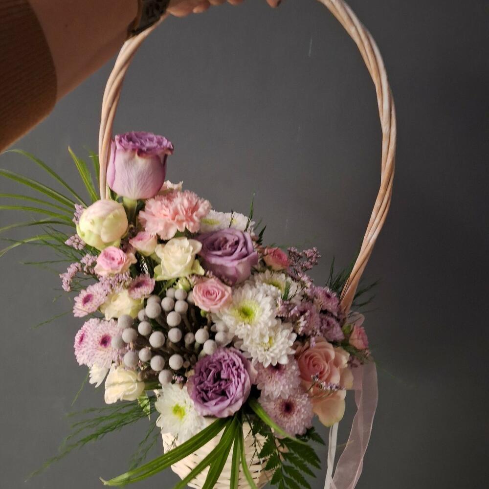 Satin ribbon - 1 pcs Chrysanthemum - 4 pcs mixed greens - 5 pcs roses - 6 pcs woven basket - 1 pcs