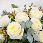 Eucalyptus - 3 pcs white roses - 15 pcs Wax flower (chamelaucium) - 5 pcs