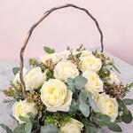 A beautifully arranged woven basket featuring 15 pristine white roses, delicately accented with soft pink wax flowers and finished with elegant touches of silvery-blue eucalyptus. The lush greenery adds a natural, airy feel, while the arched wicker handle gives the arrangement a timeless, classic charm — perfect for any special occasion.