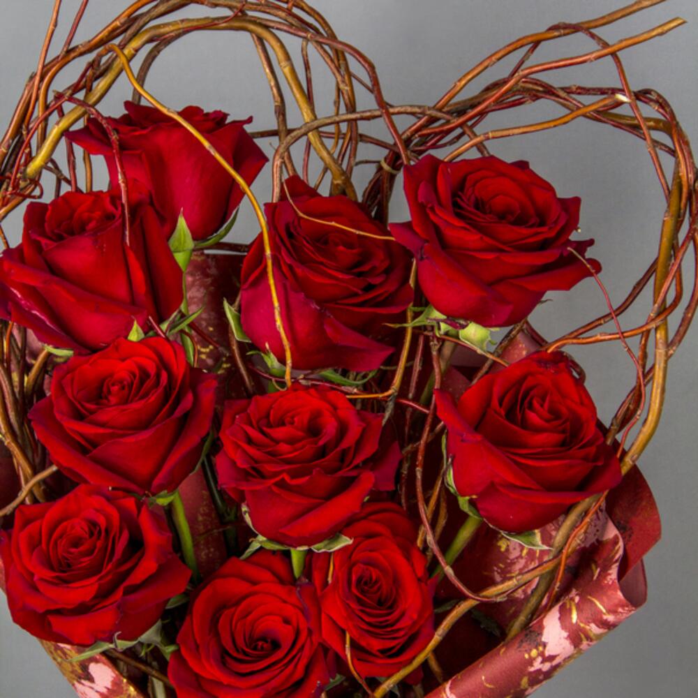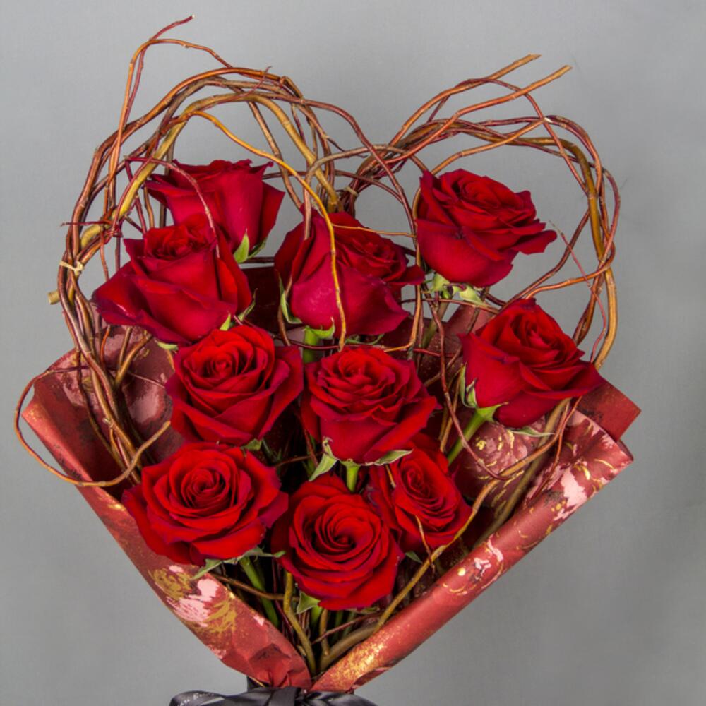 A heart shaped hand bouquet of red roses
