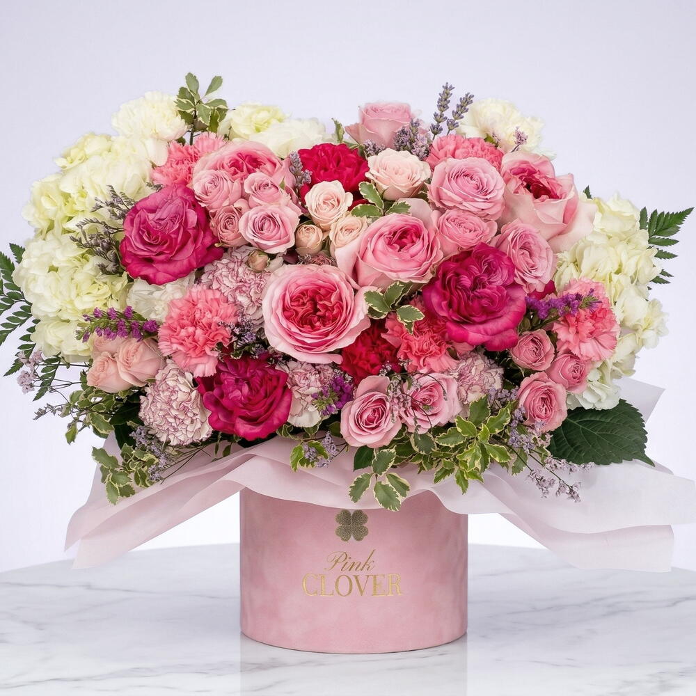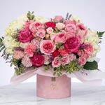 Alexandra is a charming flower arrangement with two types of pink spray roses, carnations, and hydrangeas, pink lisianthus beautifully presented in a velvet box. Make someones day brighter ordering flower delivery from a local florist. This bright and colorful flower arrangement will be a perfect choice for birthday, anniversary, any holiday or just because. Please note: The box color may differ slightly from the photo.