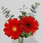 Dúo de Amor es un delicado arreglo floral compuesto por dos hermosas gerberas rojas que simbolizan amor, admiración y alegría. Acompañadas de elegante follaje de eucalipto y presentadas en un florero de vidrio transparente, crean un diseño moderno, fresco y lleno de vida. Su estilo minimalista lo convierte en el detalle perfecto para sorprender a alguien especial, celebrar un momento importante o simplemente llenar cualquier espacio con un toque de color y elegancia.