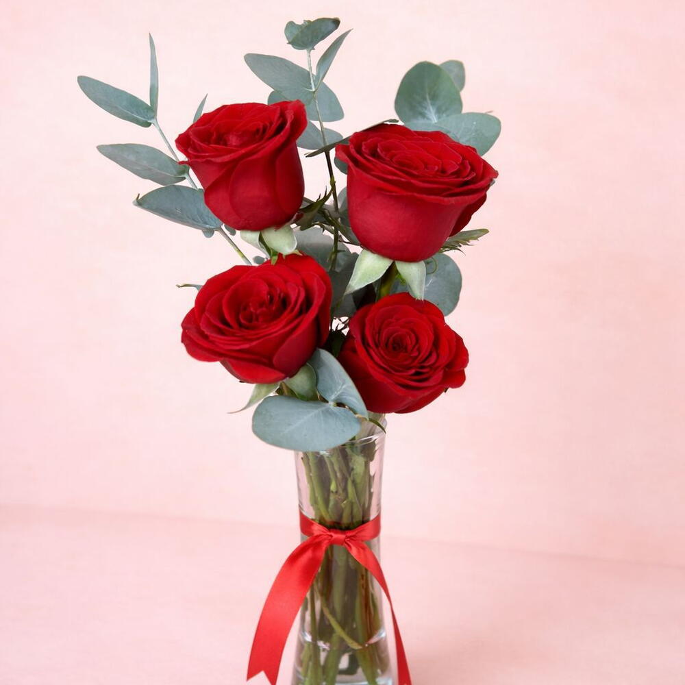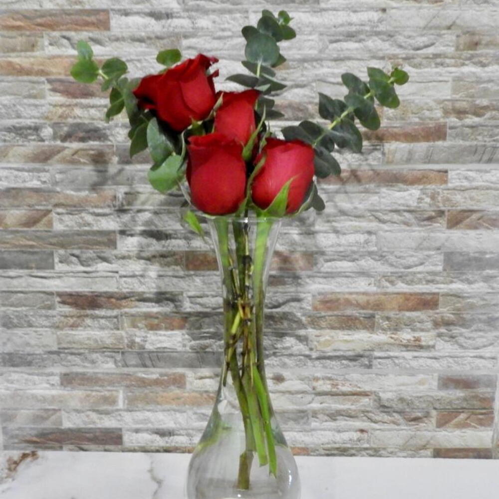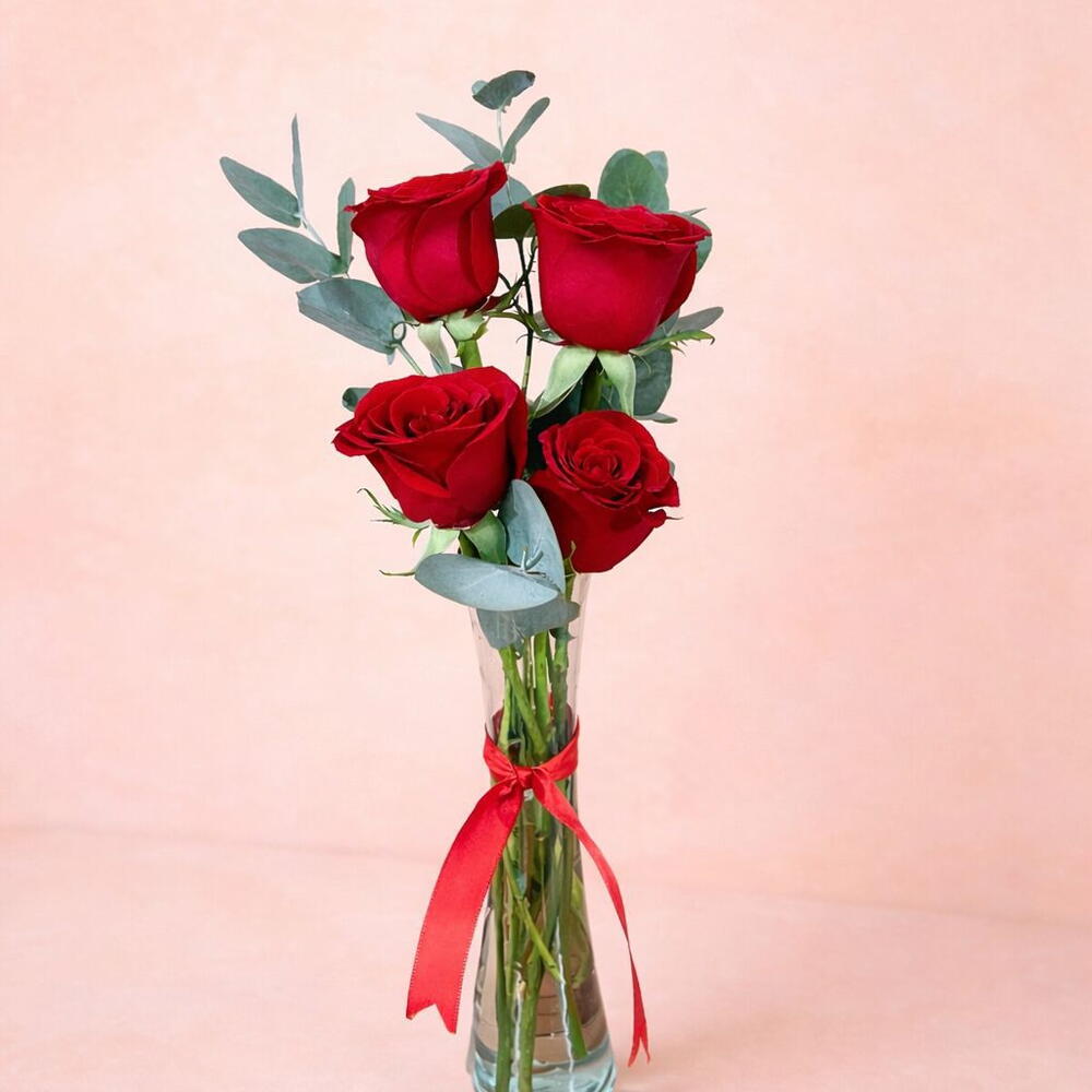 Un arreglo elegante que expresa amor, admiración y romance. Cuatro rosas rojas premium acompañadas de eucalipto fresco, presentadas en un violetero de vidrio que realza su belleza natural. Perfecto para sorprender con un detalle sofisticado y lleno de significado. * violetero puede cambiar el modelo