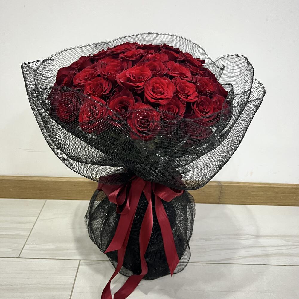 50 premium red roses meticulously crafted with chic black mesh wrapper. You can request for 49 roses or 52 roses for your preference without additional charge.
