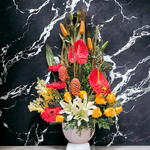 Gerbera - 3 pcs roses - 10 pcs anturios - 2 pcs lilis - 3 pcs maracas de malasia - 2 pcs perros - 3 pcs finos follajes - 1 pcs