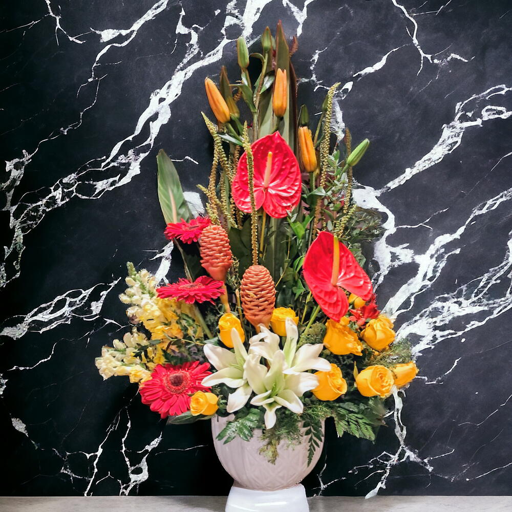 Gerbera - 3 pcs roses - 10 pcs anturios - 2 pcs lilis - 3 pcs maracas de malasia - 2 pcs perros - 3 pcs finos follajes - 1 pcs