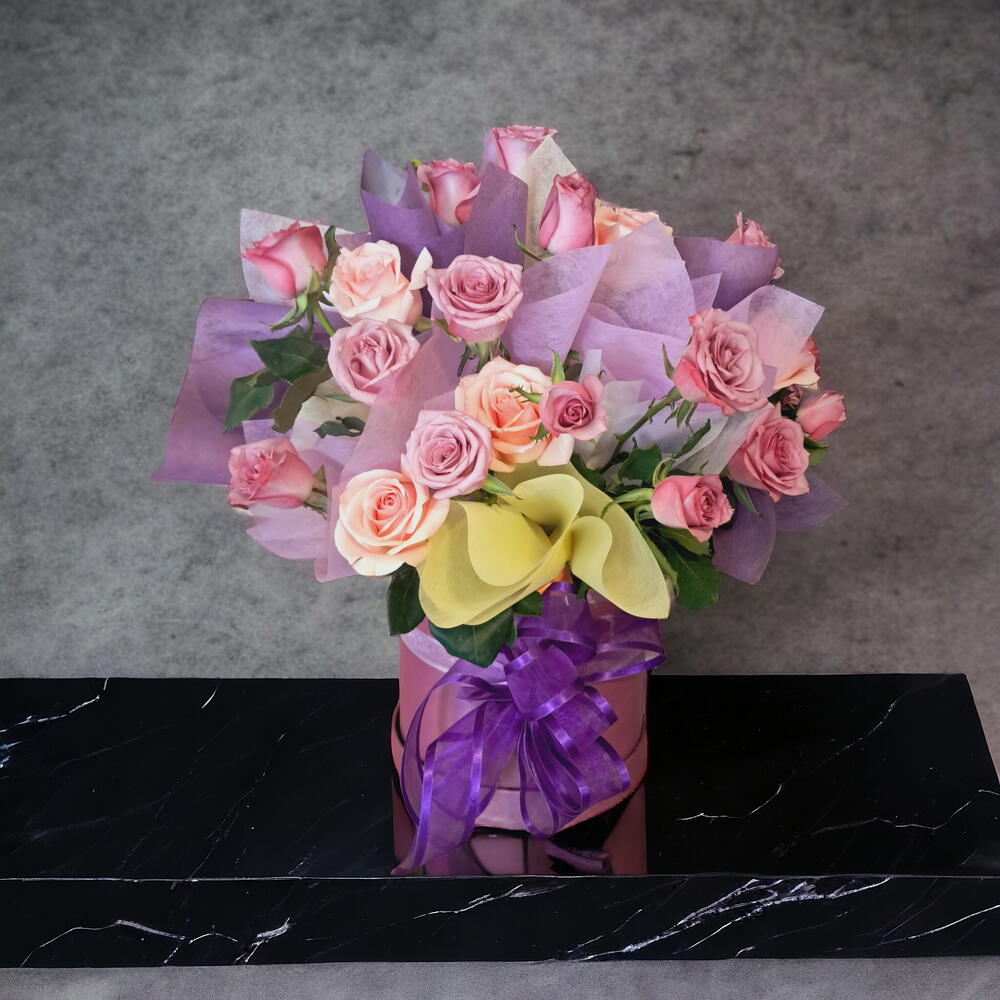 Hermoso arreglo de rosas en base redonda artesanal. Ideal para brindar vida y color a cualquier habitación. Este arreglo no pasará desapercibido en ninguna habitación.