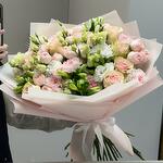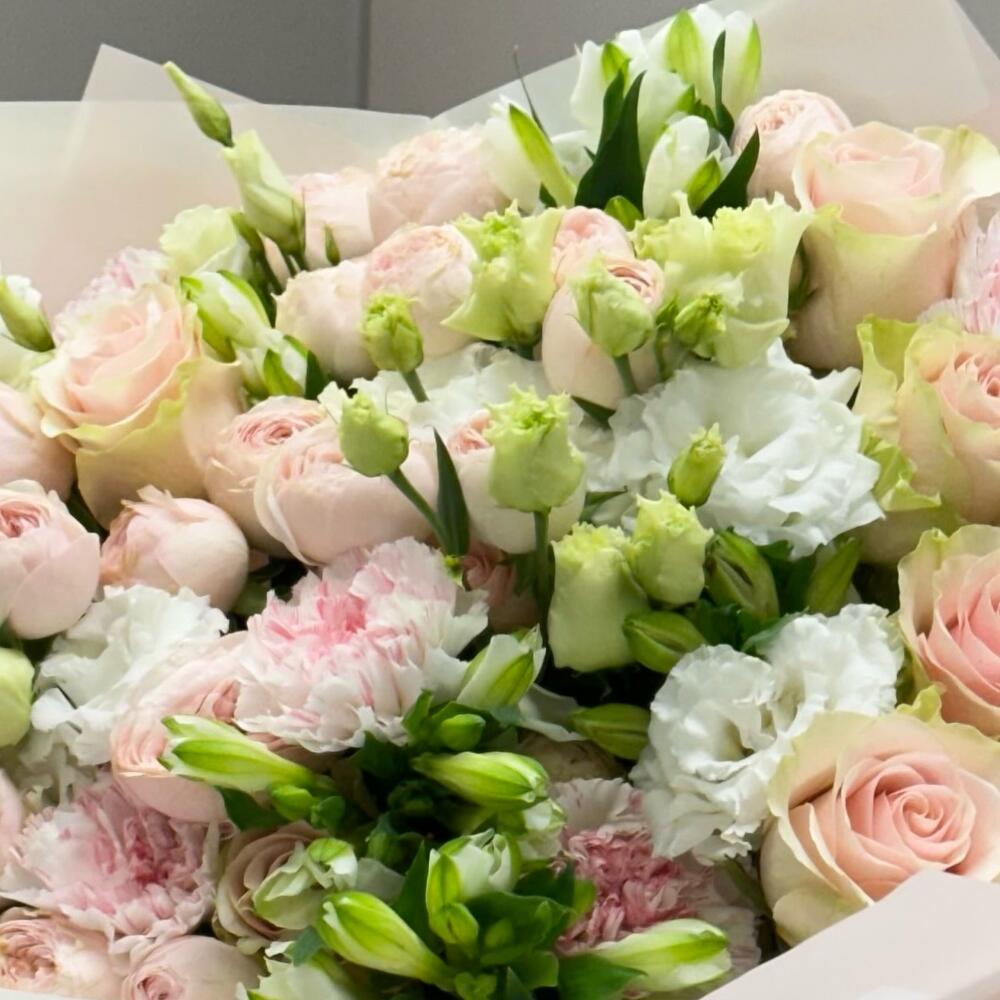 Satin ribbon - 1 pcs Eustoma - 5 pcs Alstroemeria - 7 pcs packaging - 1 pcs dianthus - 7 pcs rose ecuador 60 cm - 11 pcs peony bush rose - 7 pcs