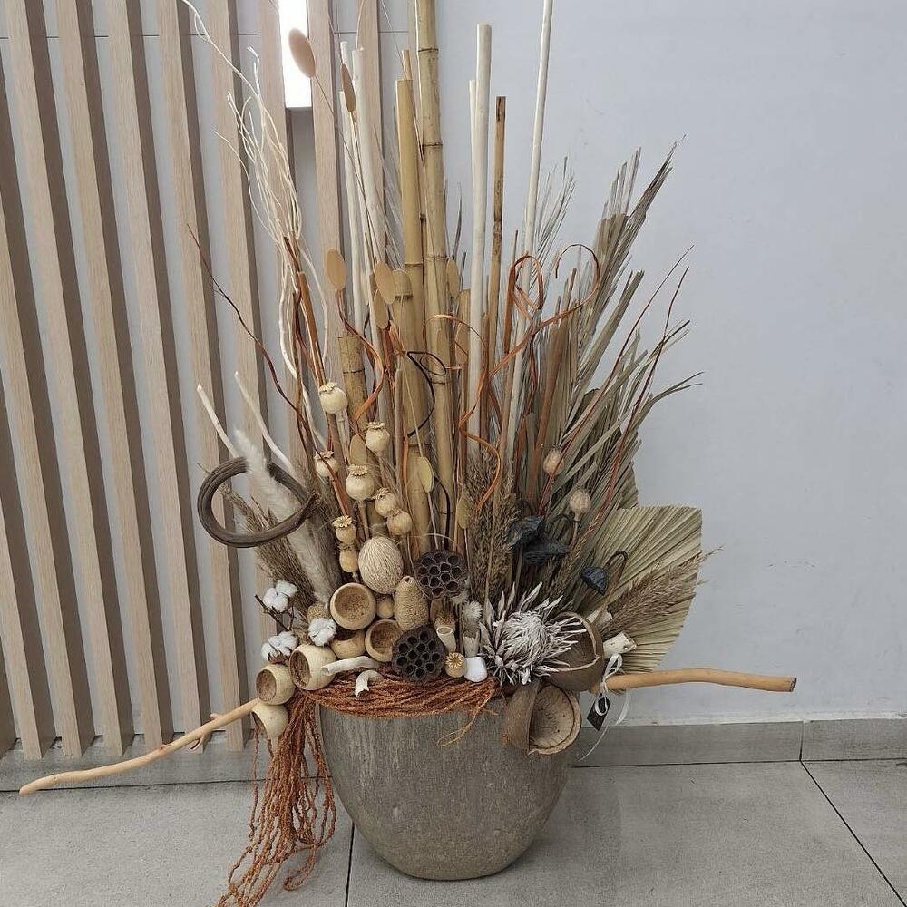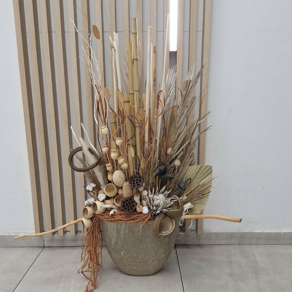 ceramic planter - 1 pcs mix dry flowers - 50 pcs dry lotus - 5 pcs dry poppy - 15 pcs dry protea - 1 pcs