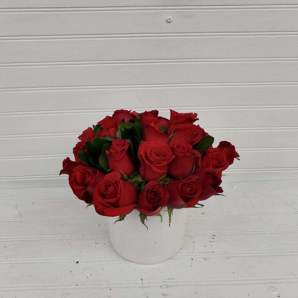 Arreglo de 24 rosas rojas en base color blanca.