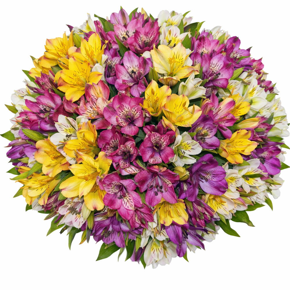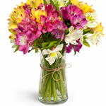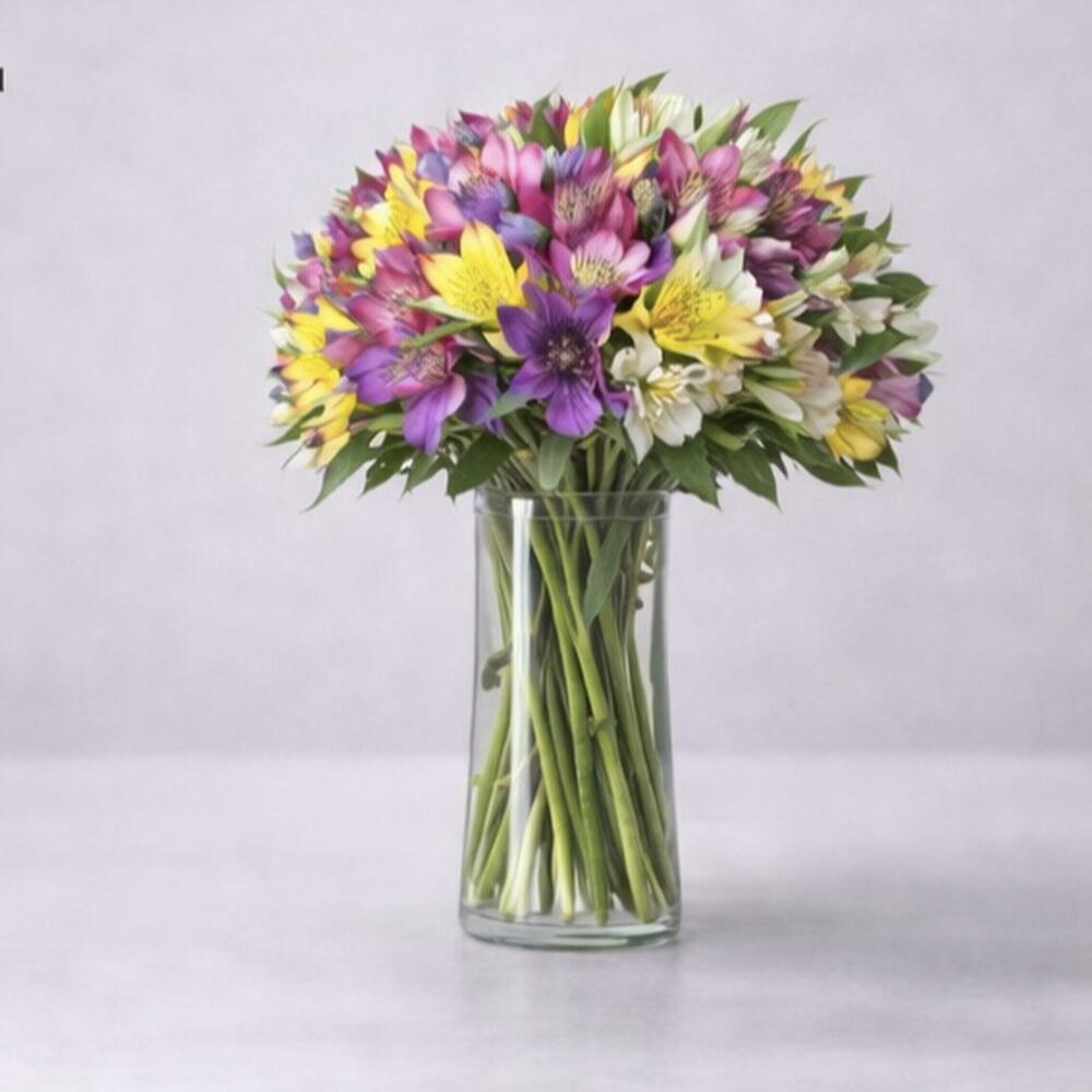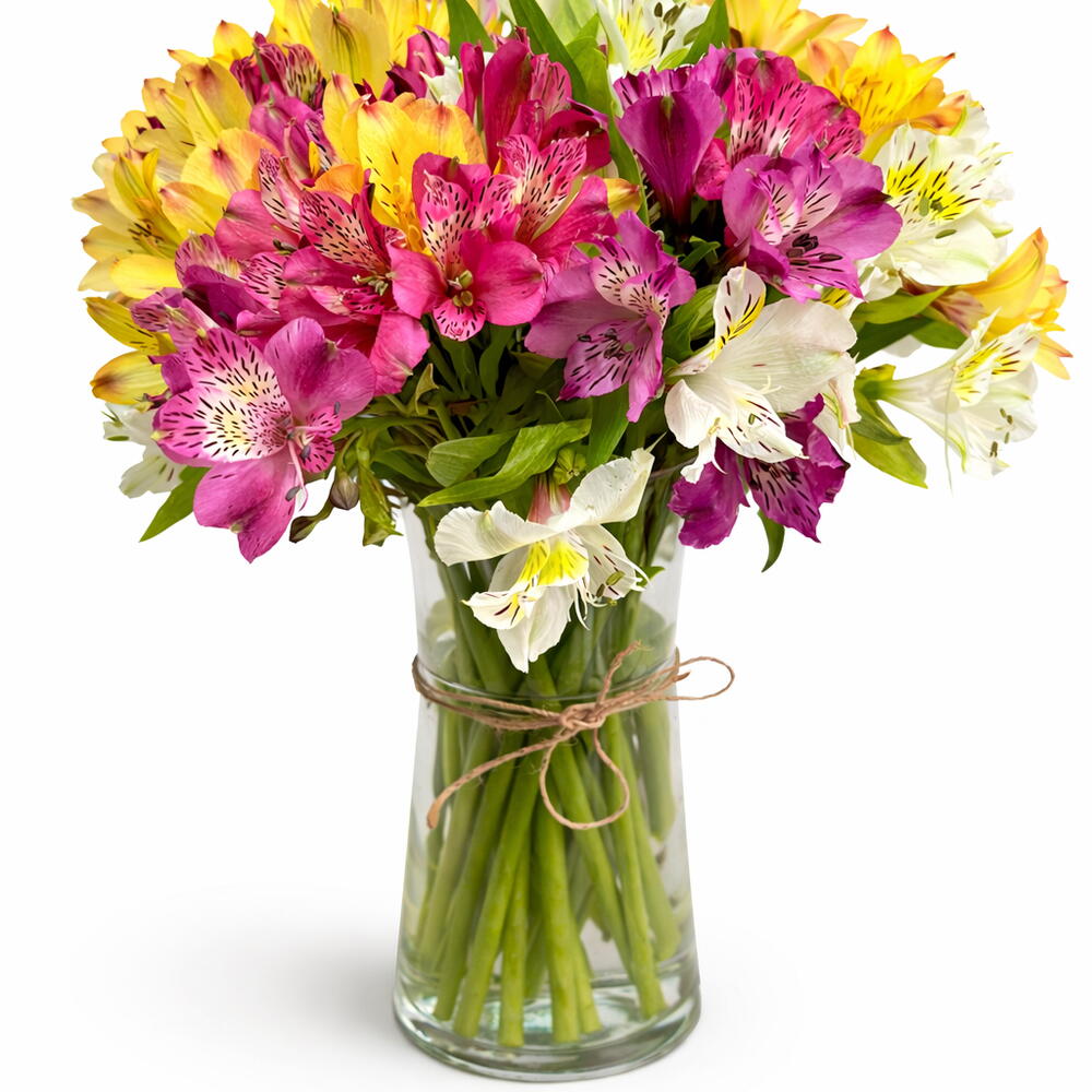 Areglo de 40 astromelias en colores mixtos con un florero en cilindro con lazo