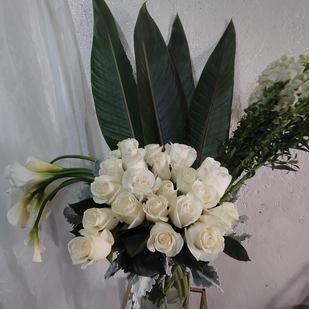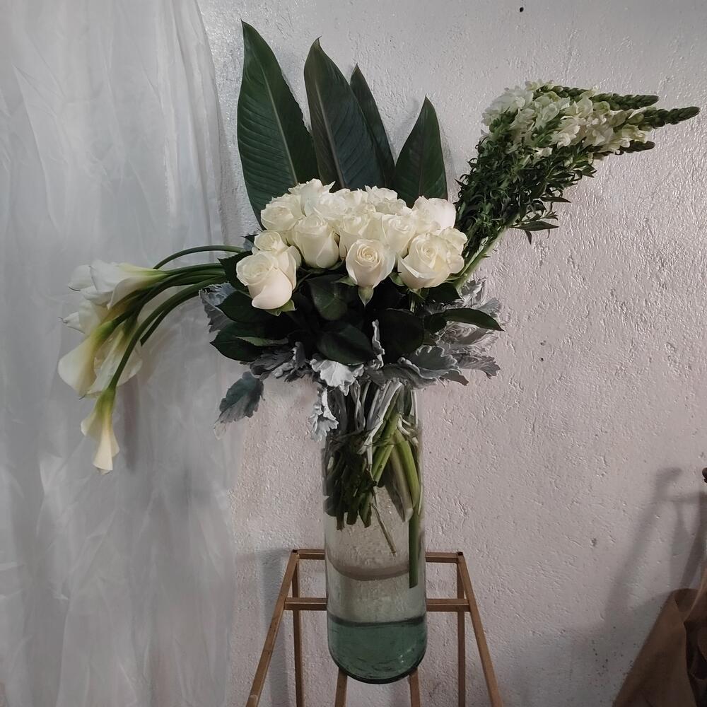 Es un cilindro con agua. Lleva dos docenas de rosa blanca de la mejor calidad. El alcatraz por lo regular lo enviamos cerrado para que les dure más y habrá al paso de los días. Antirrhinum es color blanco se limpia como toda flor para una mejor presentación.