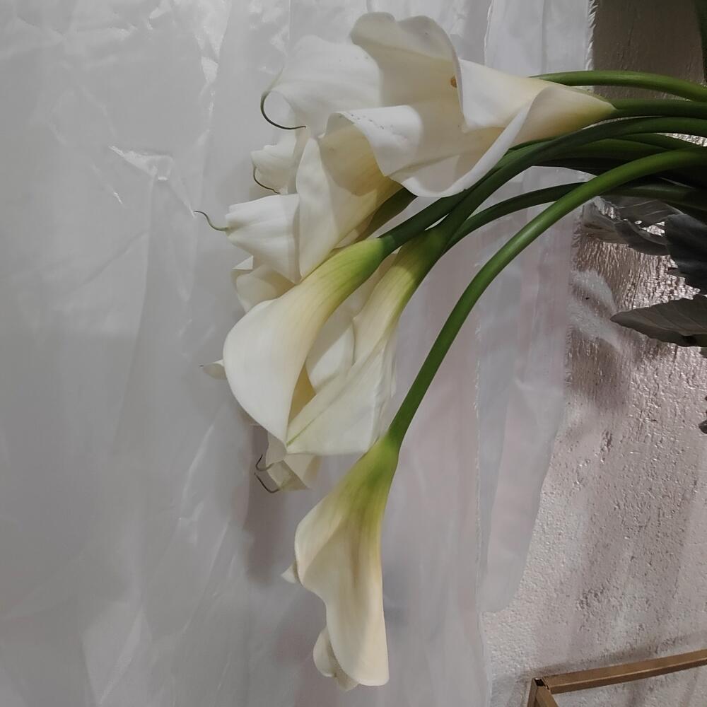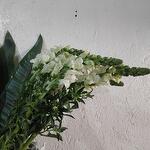 rosas blancas - 24 pcs alcatraz - 10 pcs hojas de ave - 3 pcs antirrhinum blanco - 12 pcs miller gris - 5 pcs