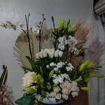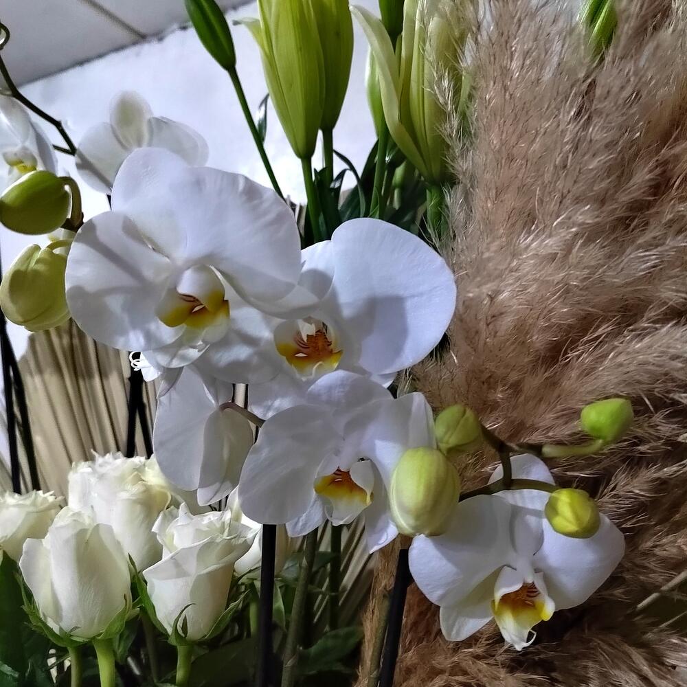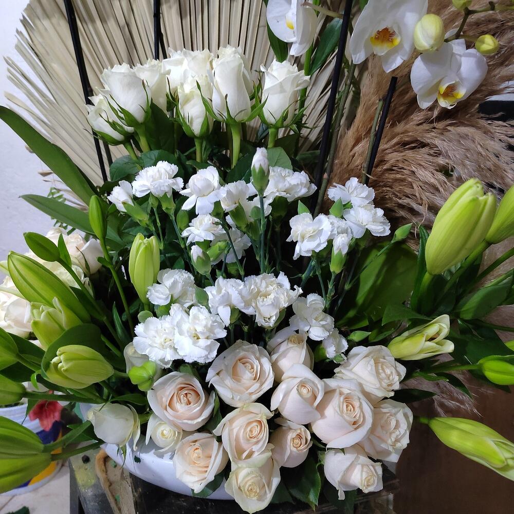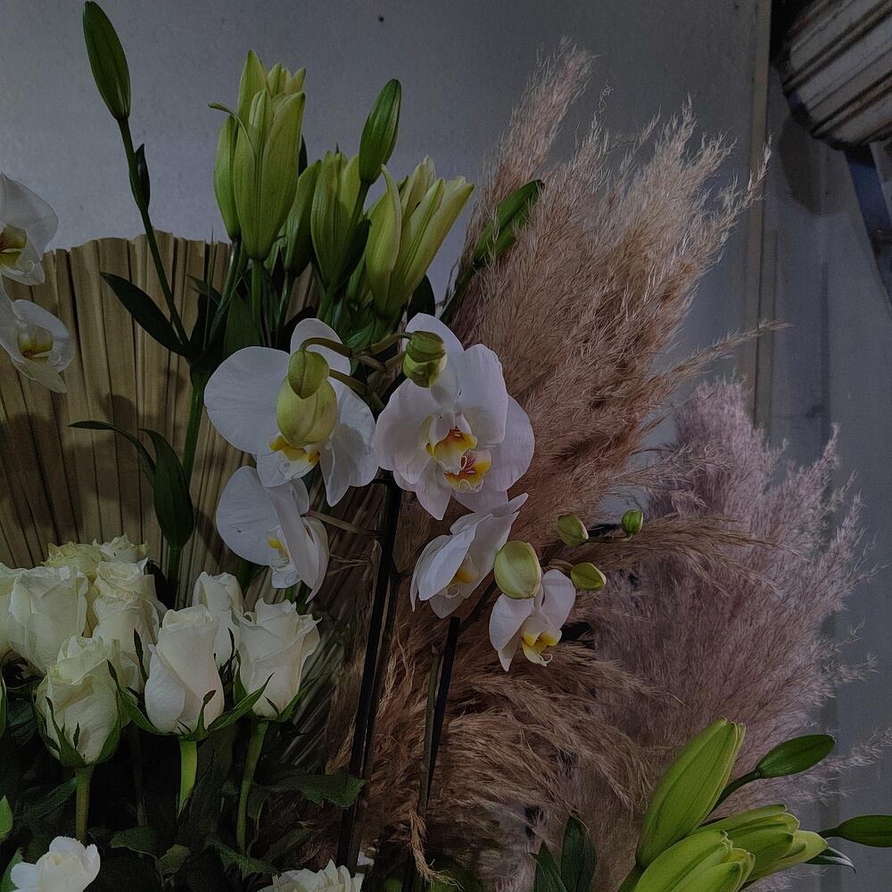 pampas - 4 pcs rosa blanca - 22 pcs white lilies - 10 pcs base de fibra de vidrio blanca - 1 pcs rosa rosita claro - 22 pcs hojas abanico - 2 pcs mini white carnation - 10 pcs orquídea blanca doble - 2 pcs