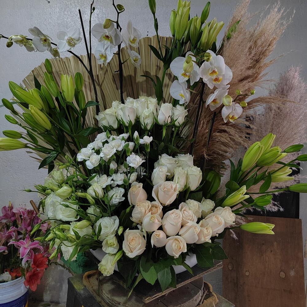Es un arreglo hermoso de gran tamaño. Las orquídeas blancas van en maceta. (No son de corte) Es grande por lo que siempre recomendamos transportarlo. Toda flor es fresca y duradera la que se maneja. Es de calidad.