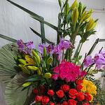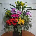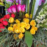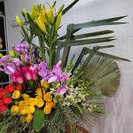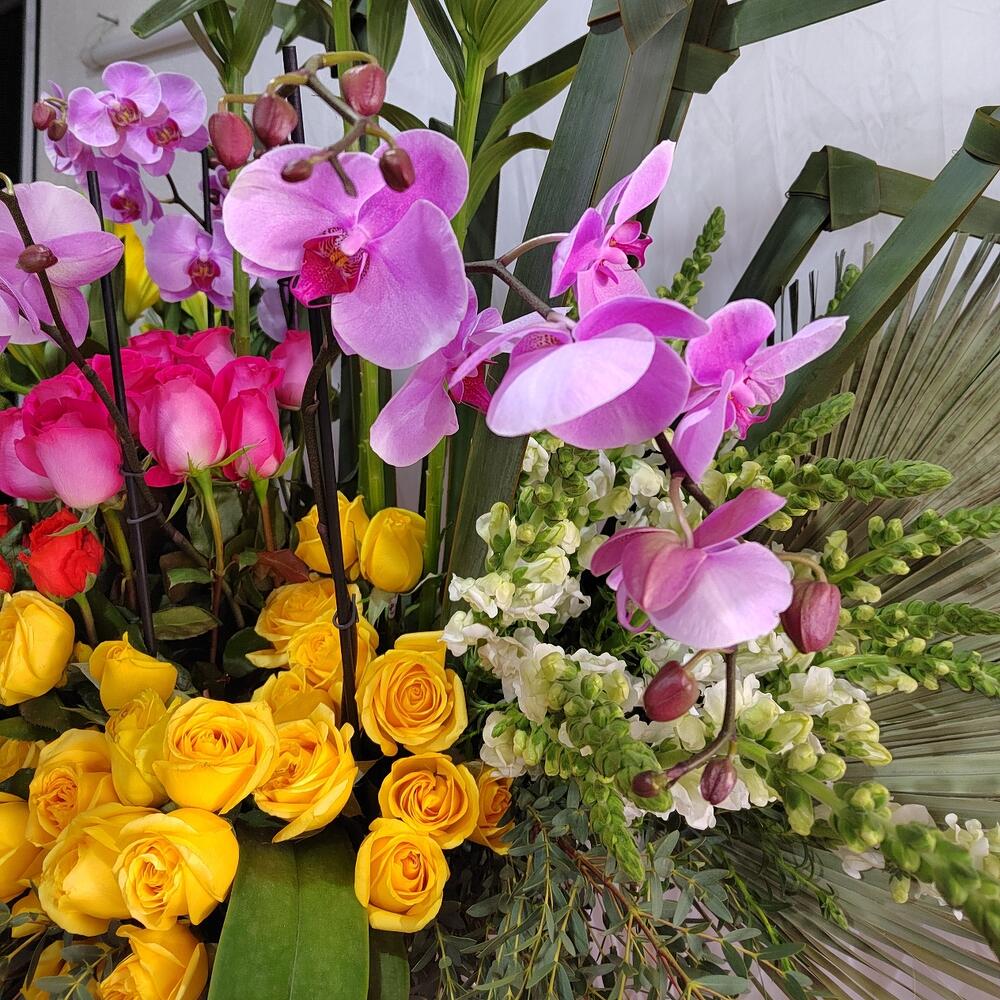 rosa amarilla - 20 pcs caja negra elegance - 1 pcs orange rose - 20 pcs foliage or complement - 10 pcs lilis amarillas - 10 pcs espadas - 10 pcs perritos blancos - 11 pcs rosa rosa fuerte - 20 pcs hoja abanico - 4 pcs orquídea en maceta doble bara - 2 pcs