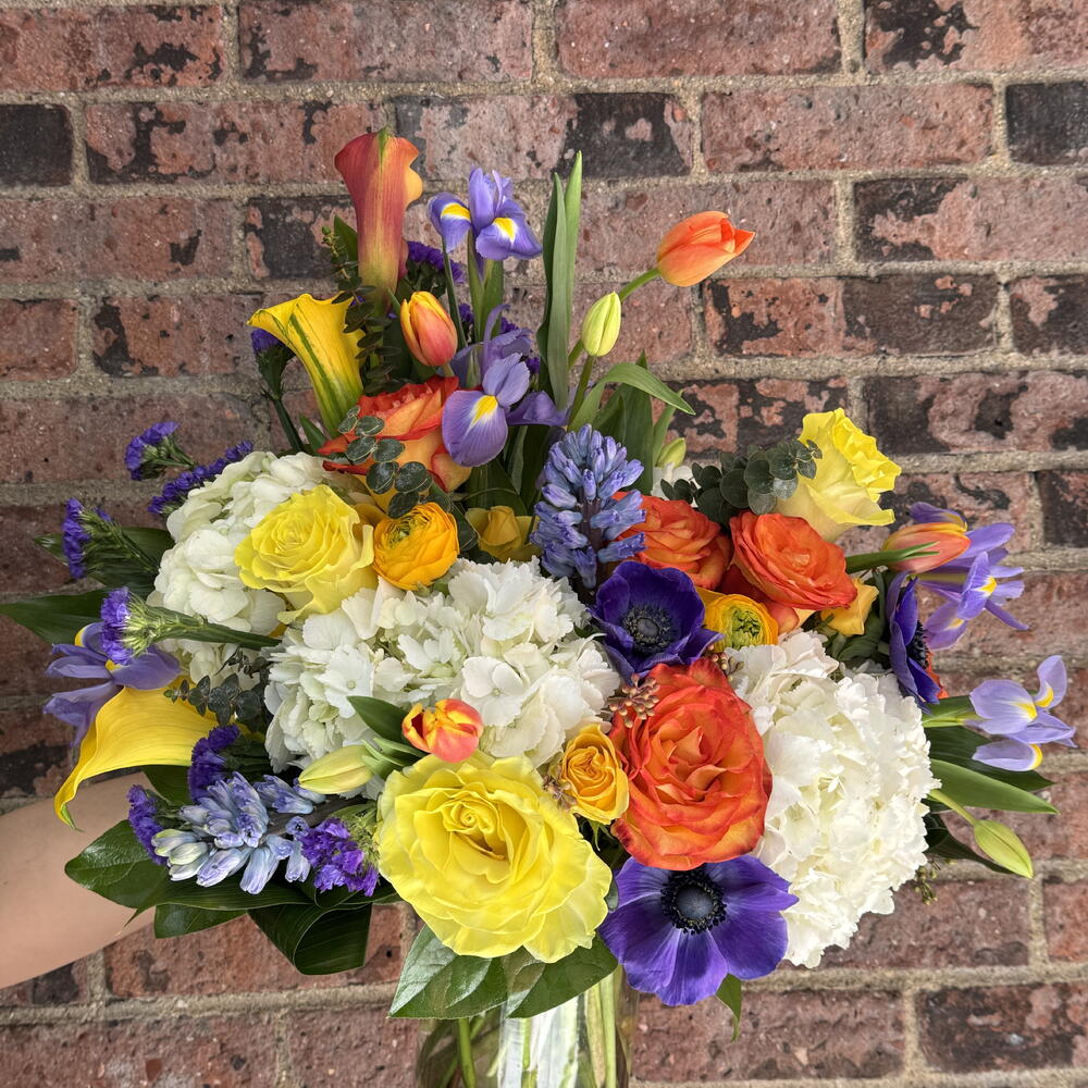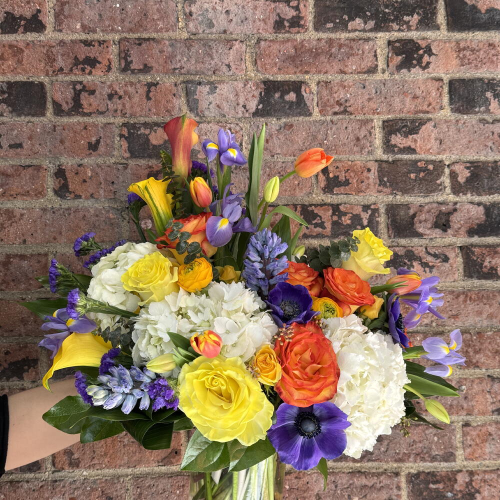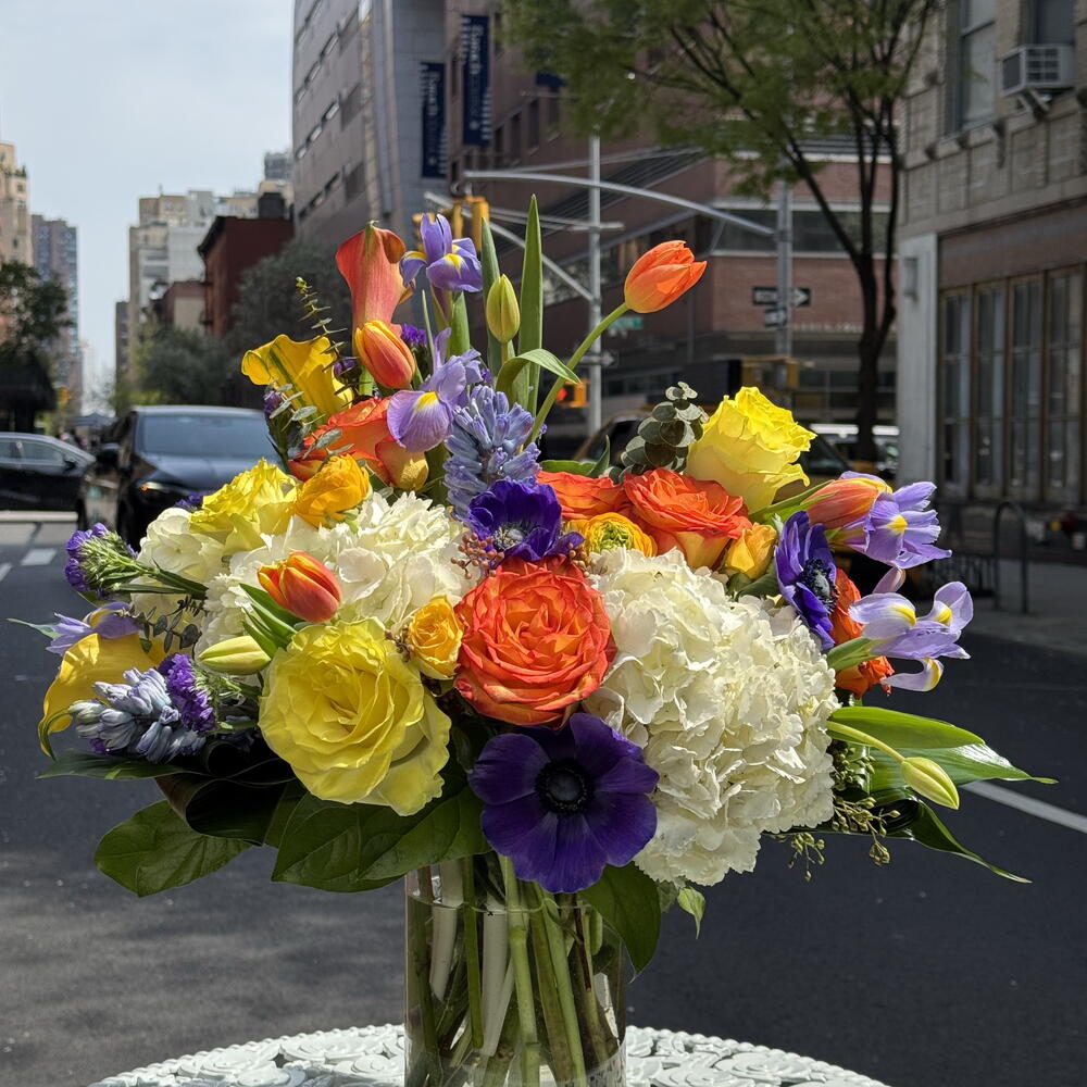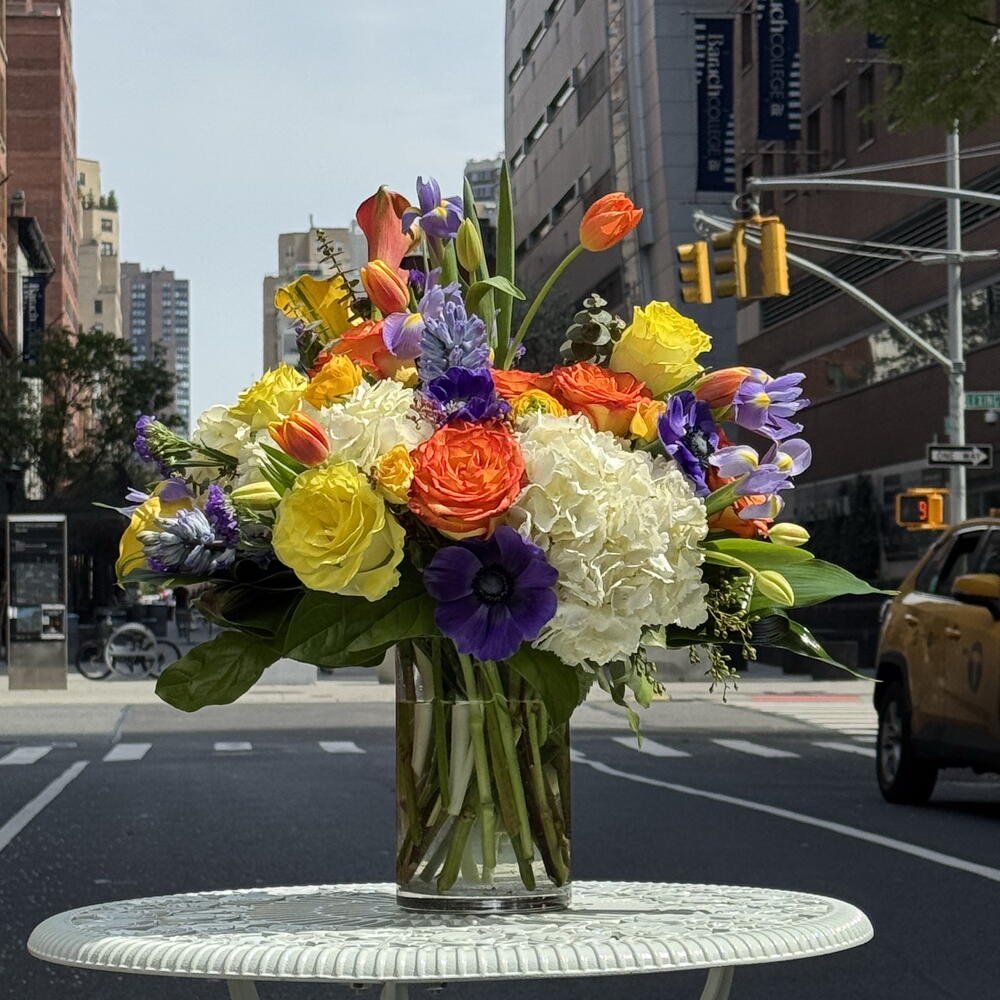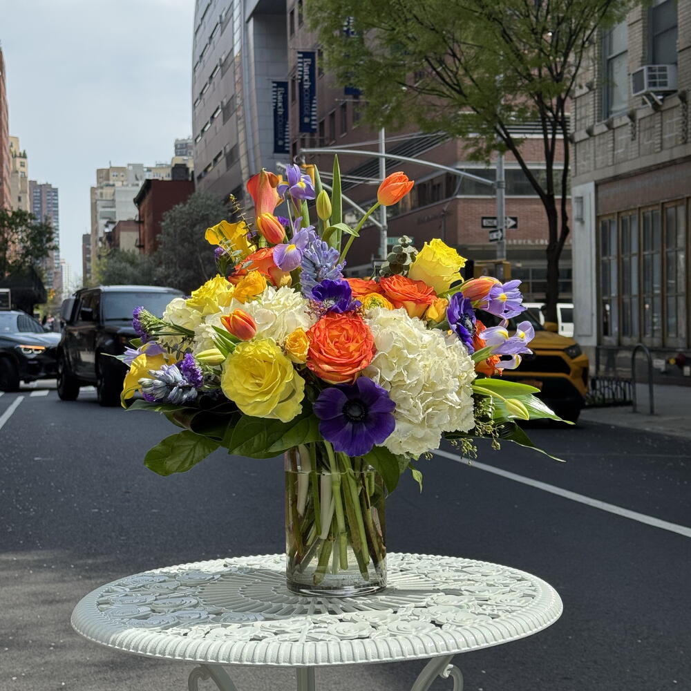 Elevate your space with the beautiful blooms of Aurelie. Expertly arranged, this floral design features callas, hydrangeas, roses, tulips, iris, hyacinth, ranunculus. This symphony of blooms in yellow, orange and purple will bring life and color to any room. Choose Aurelie for exceptional quality and style.