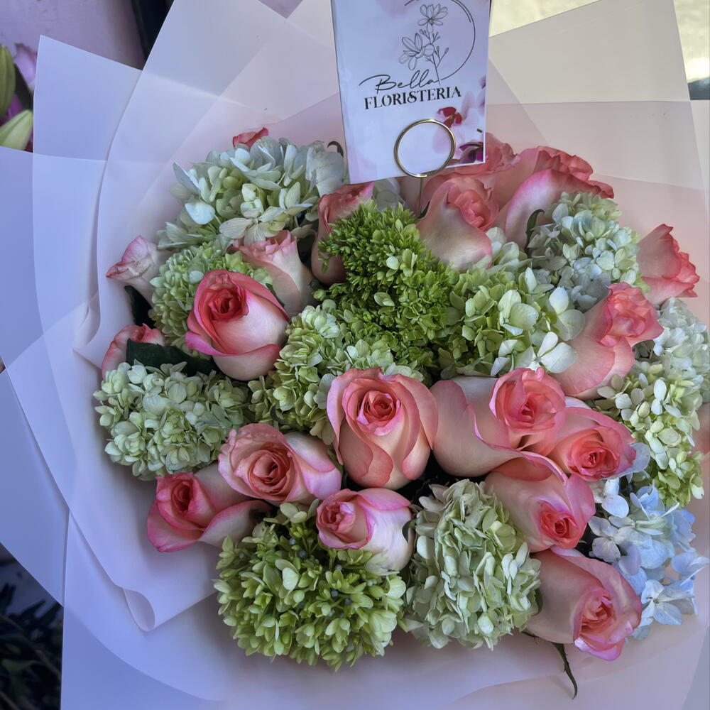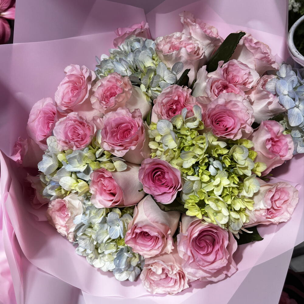 Hermoso ramo en tonos rosas con hortensias en color de temporada Azul,blanco,verde o lila