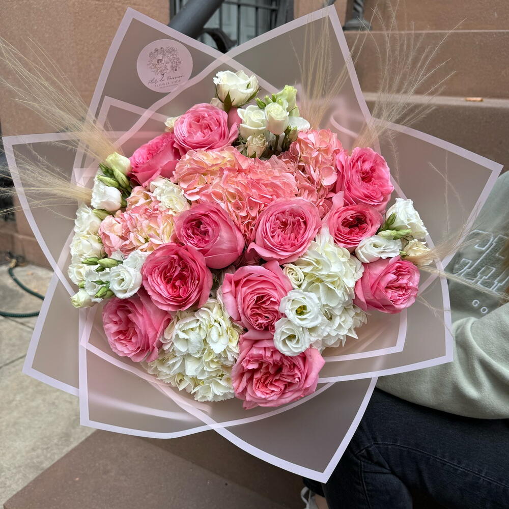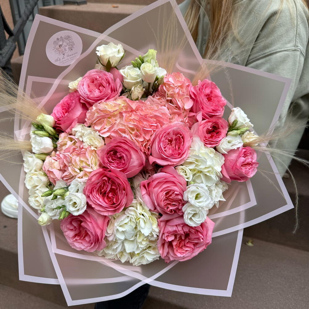 white lisianthus - 7 pcs pink hydrangeas - 3 pcs white hydrangeas - 2 pcs stipa - 5 pcs pink expresion garden rose - 11 pcs white spray roses - 5 pcs