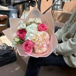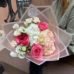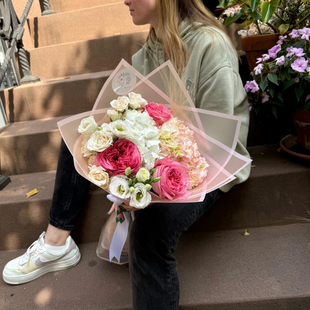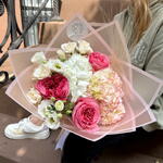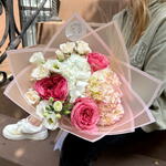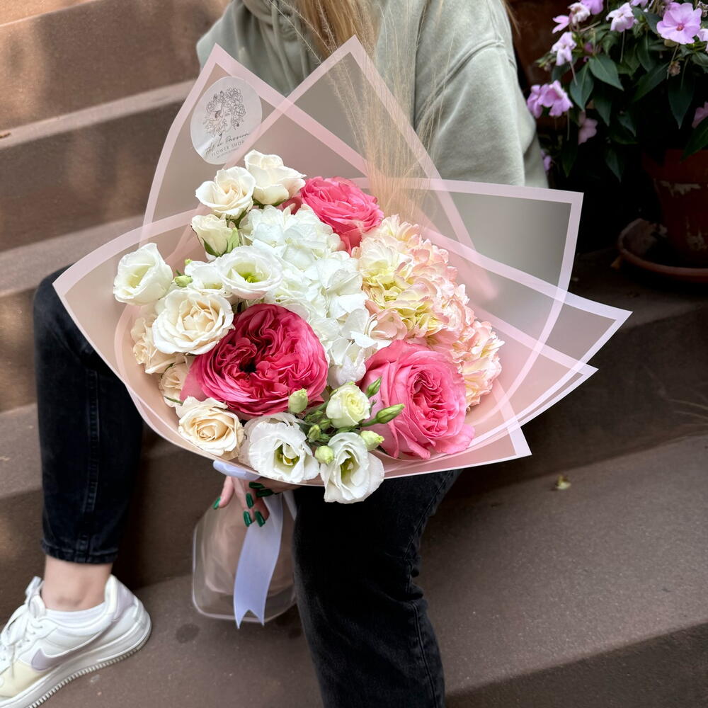 lisianthus white - 2 pcs spray rose white - 2 pcs white hydrangea - 1 pcs pink hydrangea - 1 pcs stipa - 1 pcs pink expression garden rose - 3 pcs