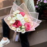 Букет красивый получился. Доставили немного позже назначенного времени, не критично для нас это было. Фото отчет сделали быстро. Доставка считаю дорогая, плюс большие розы не первой свежести были.