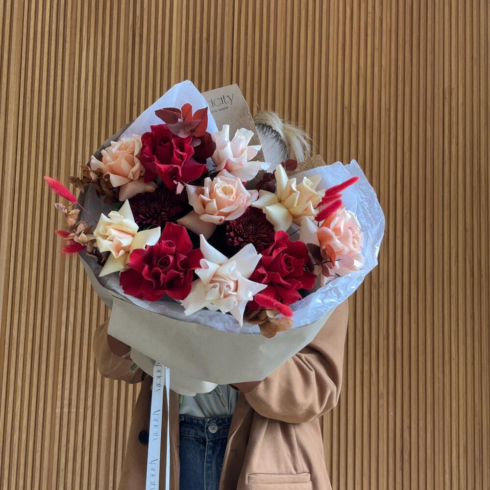 bunny tail - 7 pcs eucalyptus stems - 5 pcs hrysantema - 2 pcs french roses - 9 pcs