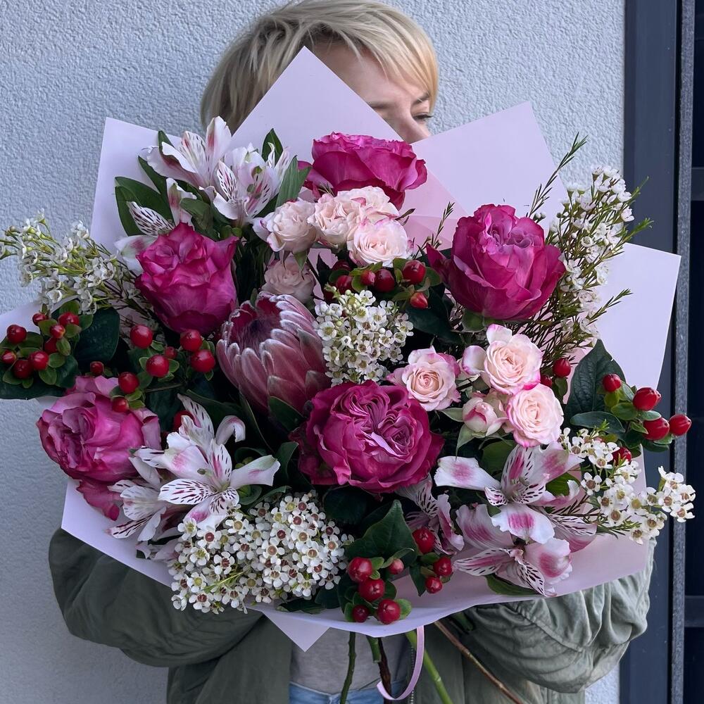 Alstroemeria - 3 pcs Wax flower - 5 pcs greeery - 5 pcs protea - 1 pcs rose spray - 2 pcs hypericum - 5 pcs rose country blues - 5 pcs