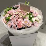 Eustoma - 3 pcs Chrysanthemum - 3 pcs Alstroemeria - 5 pcs dianthus - 3 pcs wrapping paper - 5 pcs spray rose mix - 5 pcs bag - 1 pcs aqua box - 1 pcs roses - 3 pcs