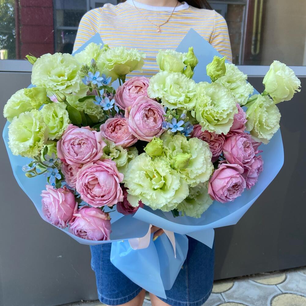 Авторский букет из эустомы кустовой розы и незабудок