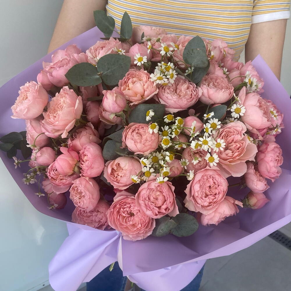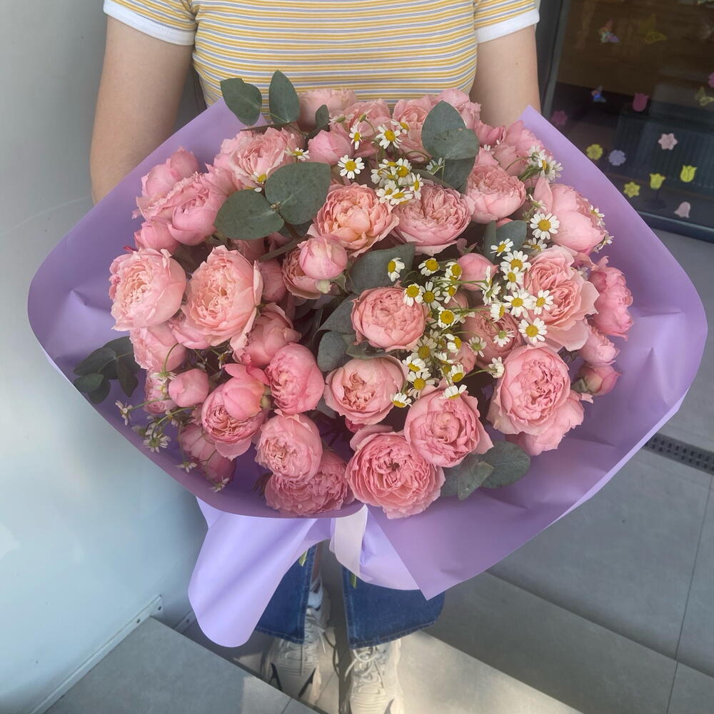 Авторский букет из розы Джульетта, ромашки и эвкалипта