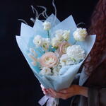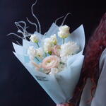 Eustoma - 4 pcs Pistachio - 4 pcs ranunculus - 2 pcs lagurus - 5 pcs korean foil - 4 pcs stifa - 3 pcs