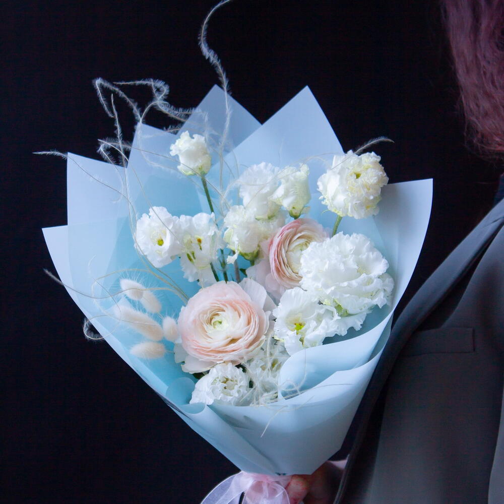 Eustoma - 4 pcs Pistachio - 4 pcs ranunculus - 2 pcs lagurus - 5 pcs korean foil - 4 pcs stifa - 3 pcs
