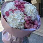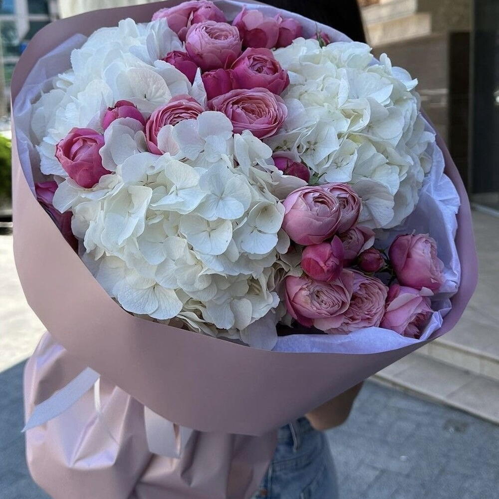 premium white hydrangea - 3 pcs silva pink bush rose - 6 pcs