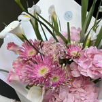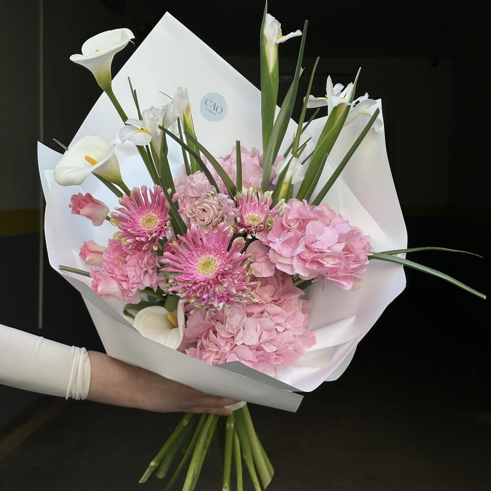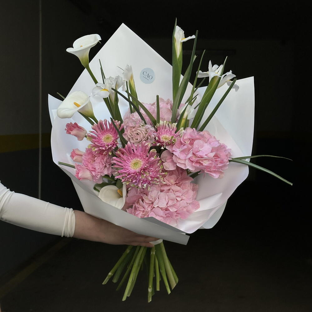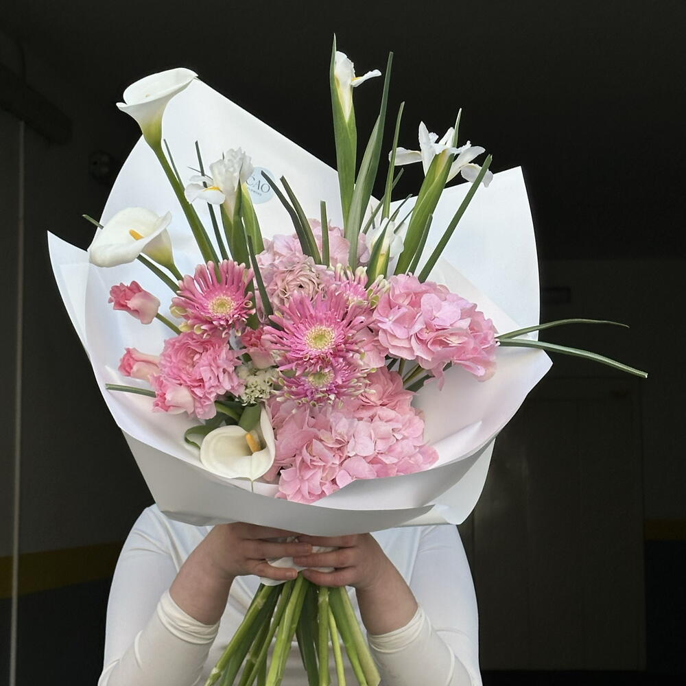 Hydrangea - 3 pcs Iris - 5 pcs Gerbera - 4 pcs Tulip - 4 pcs calla - 3 pcs ranunculus - 4 pcs