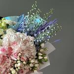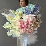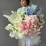 Eustoma - 5 pcs Hydrangea - 5 pcs Anthurium - 3 pcs rose - 14 pcs dianthus - 14 pcs lagurus - 1 pcs freesia - 5 pcs cortaderia - 3 pcs rose spray - 5 pcs phalenopsis orchid - 1 pcs palm dry leaves - 2 pcs
