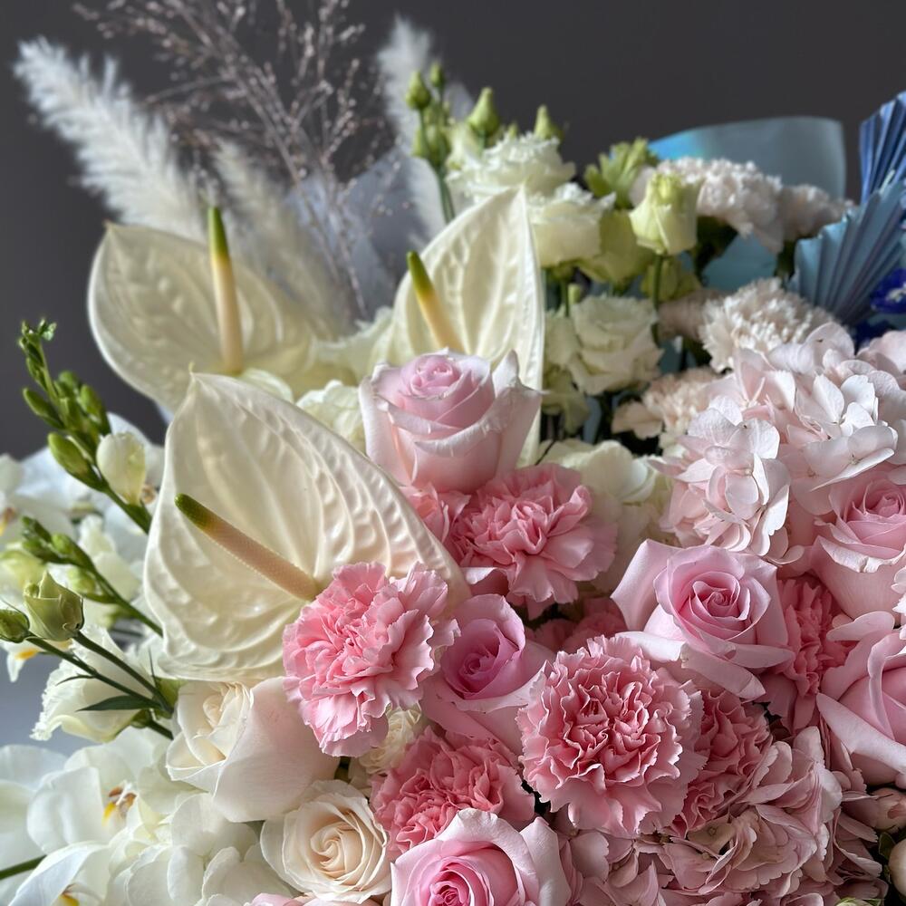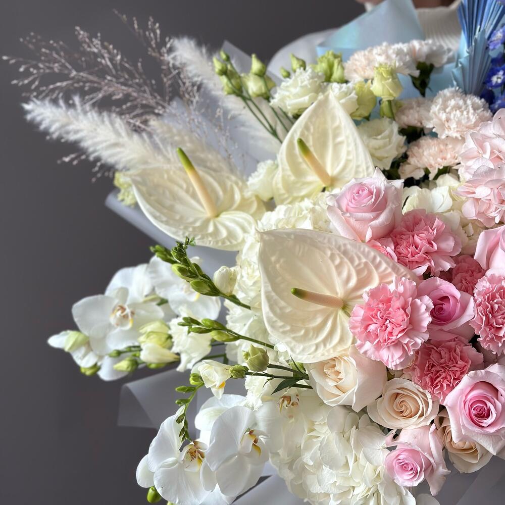 Eustoma - 5 pcs Hydrangea - 5 pcs Anthurium - 3 pcs rose - 14 pcs dianthus - 14 pcs lagurus - 1 pcs freesia - 5 pcs cortaderia - 3 pcs rose spray - 5 pcs phalenopsis orchid - 1 pcs palm dry leaves - 2 pcs