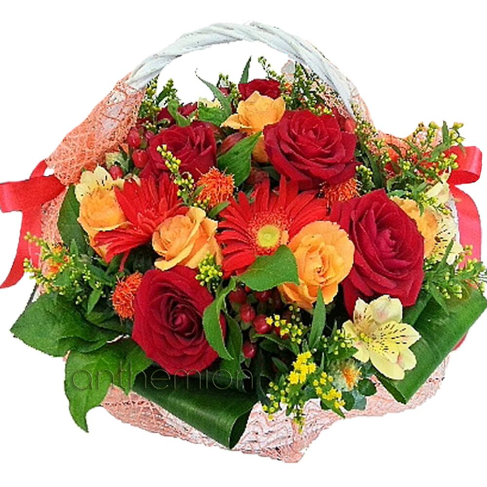 A charming basket filled with roses, gerberas, hypericum, chrysanthemums in shades of red, orange and light green creating a lovely gift to celebrate any occasion.