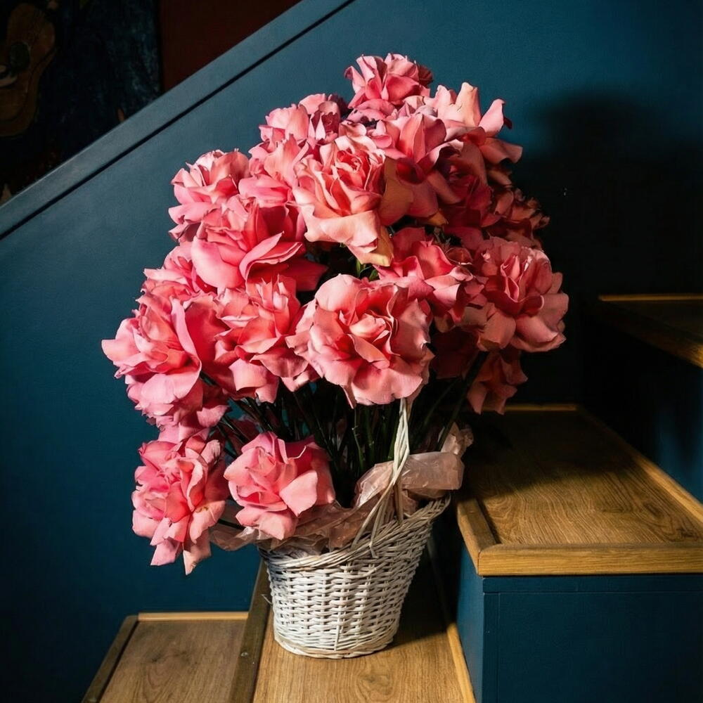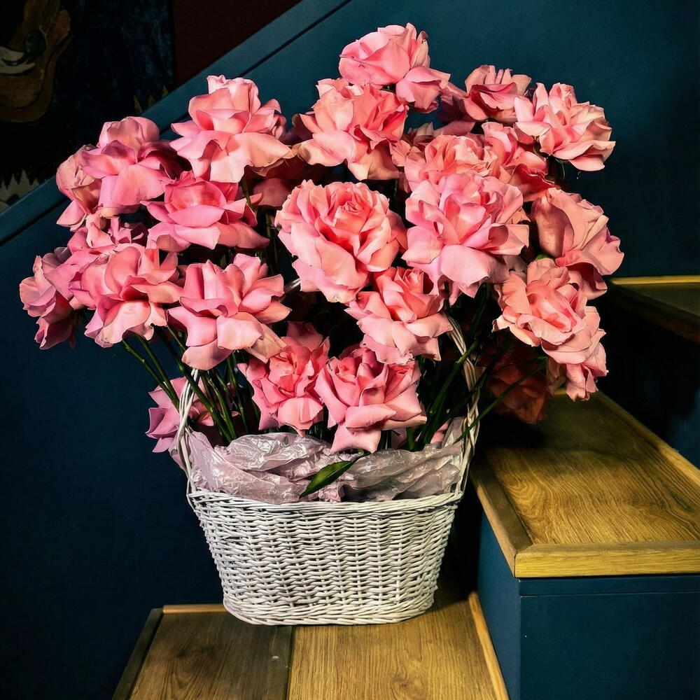 A stunning basket of 50 fresh Ecuadorian roses, elegantly arranged and carefully packed with love. Perfect for any occasion, this luxurious bouquet brings beauty and sophistication to your space. A timeless gift that speaks volumes.