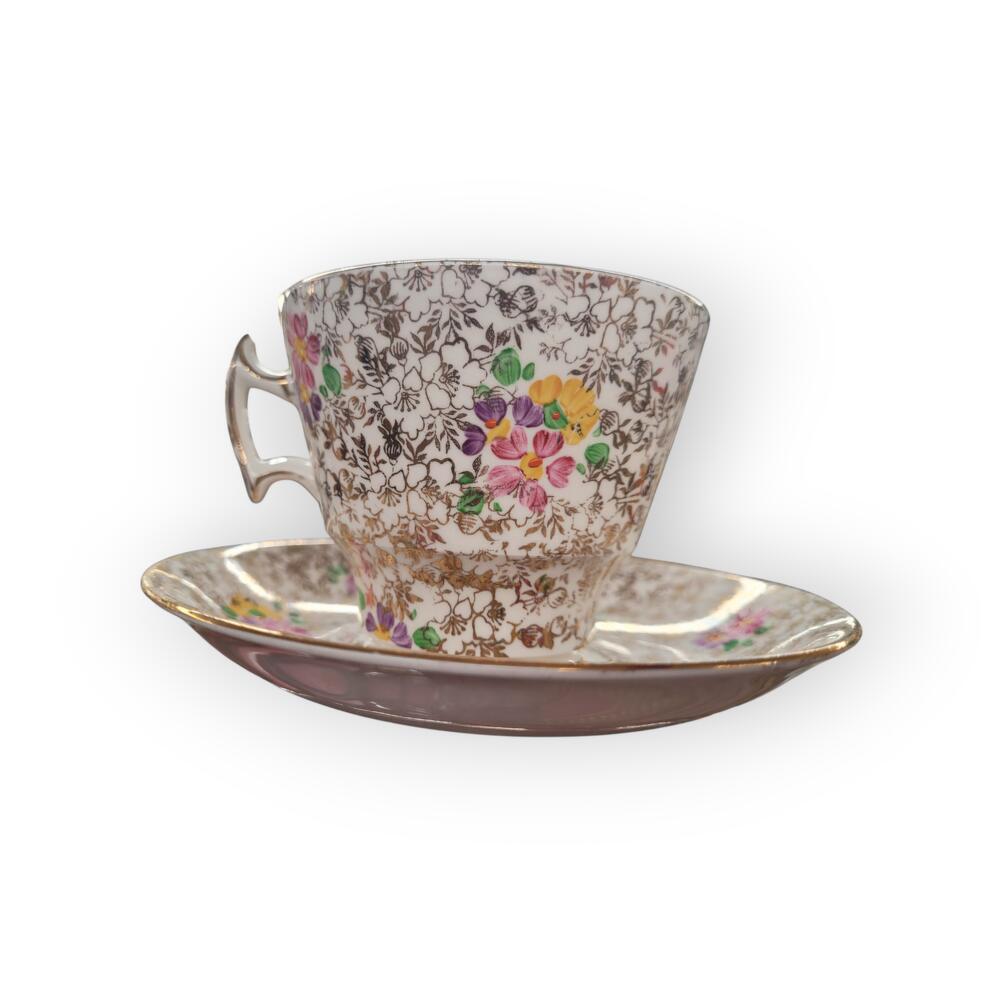 Beatrice arangment, flowers in vintage cup and soucer