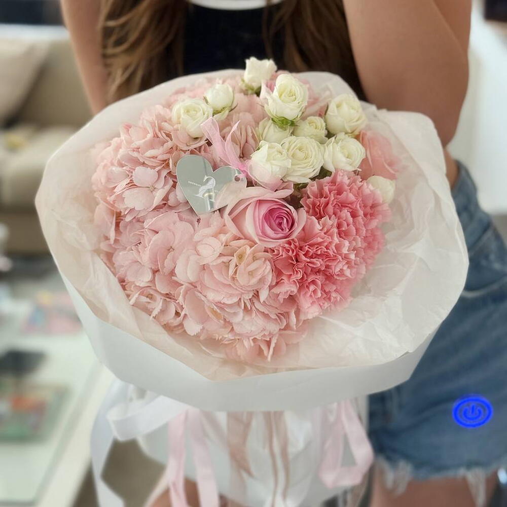 pink carnations - 3 pcs hydrangeas pink - 3 pcs pink roses - 2 pcs spray roses white - 3 pcs