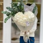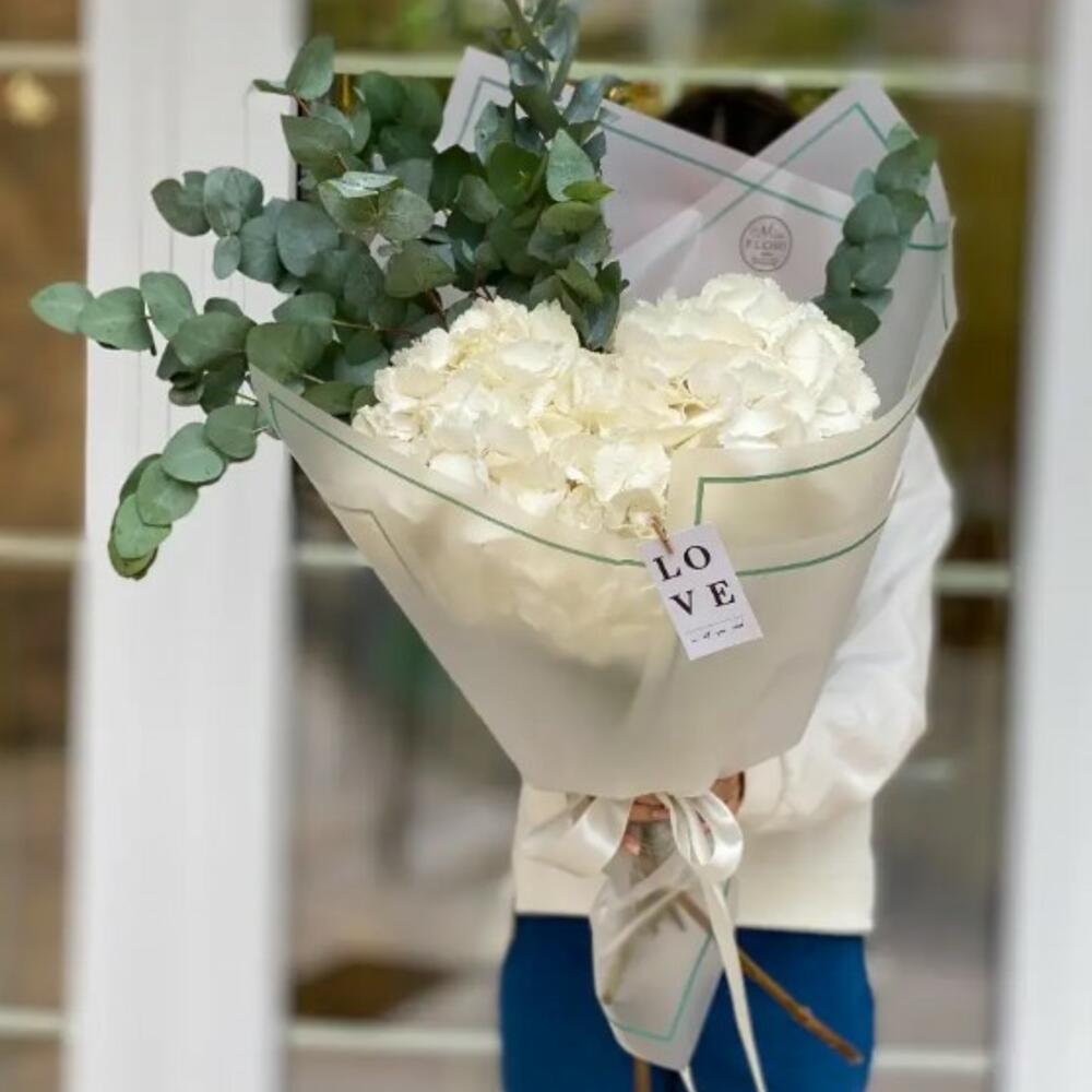 Eucalyptus - 4 pcs Satin Ribbon - 2 pcs White hydrangea - 3 pcs Korean packaging - 3 pcs