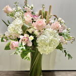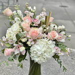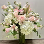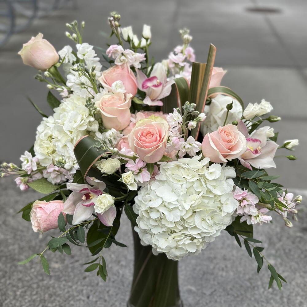 A gentle cascade of blush-hues roses, creamy hydrangeas, soft stock with elegant orchids creates a dreamy, romantic display. Whispering hints of eucalyptus lend an airy freshness, reminiscent of the delicate aroma of a crisp wine. Light and graceful, this arrangement embodies understated sophistication- perfect for moments of quiet celebration and effortless charm.