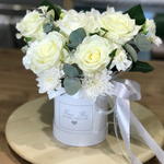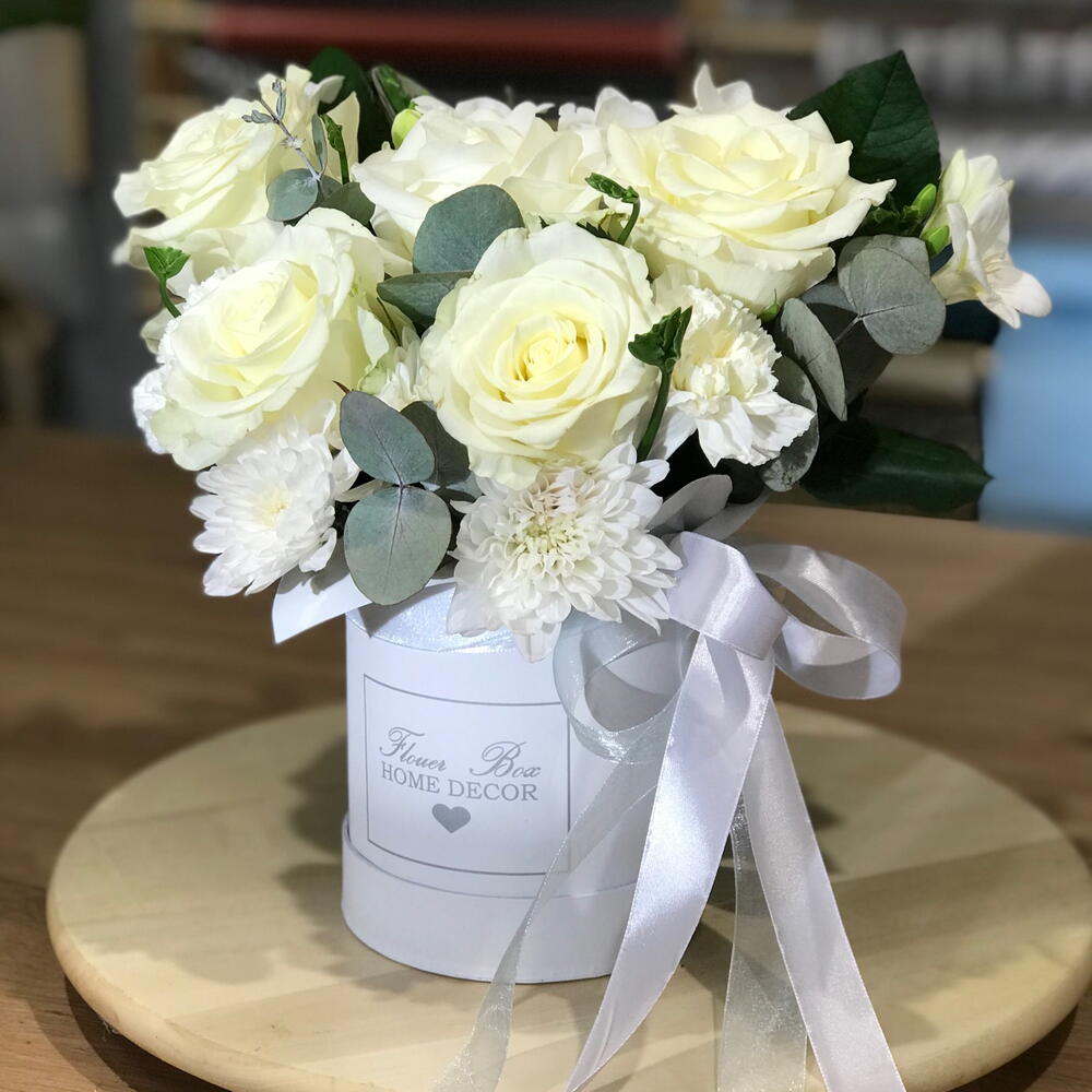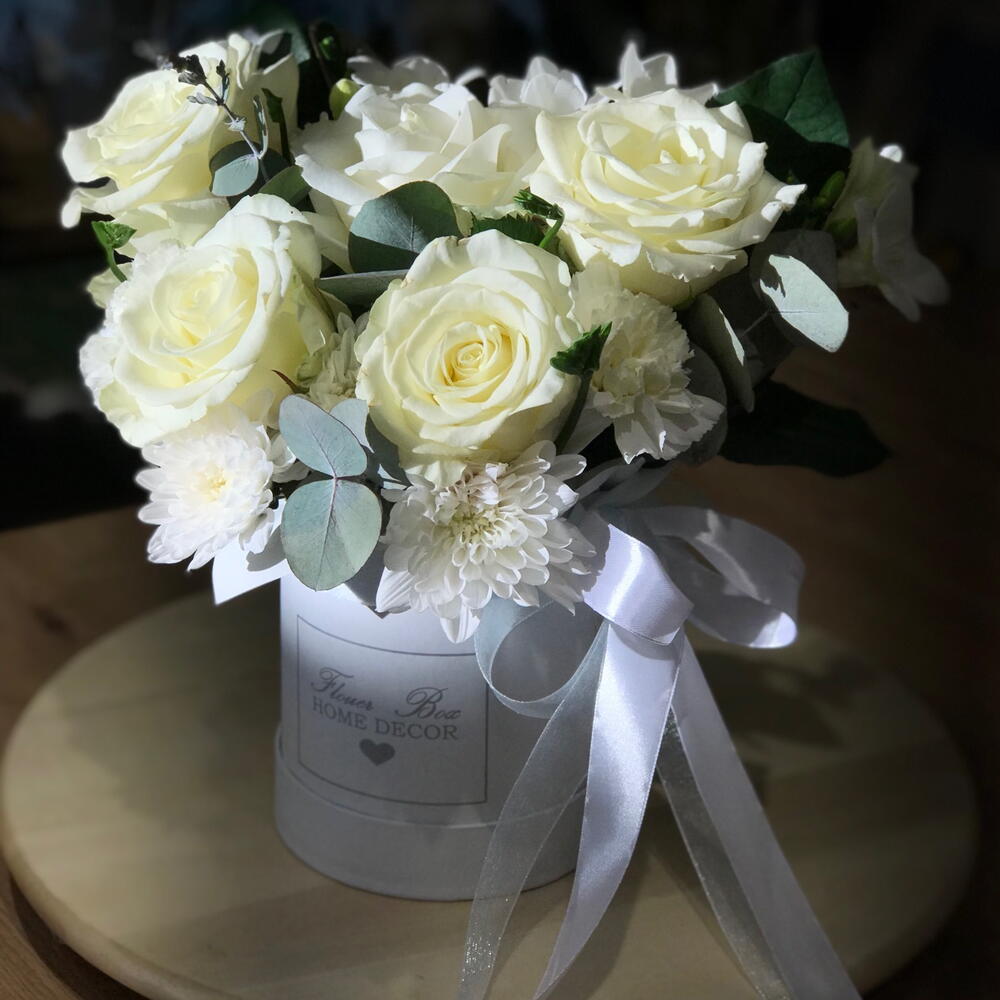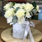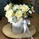 rose - 5 pcs eucalyptus - 3 pcs carnation - 2 pcs daisy white - 2 pcs freesia - 4 pcs decorative greenery - 3 pcs