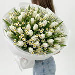 Skład bukietu: białe tulipany, rumianek, papier dekoracyjny W zestawie: aquabox, odżywka do kwiatów, bilecik z Twoimi życzeniami, bilecik jak dbać o kwiaty Na zdjęciu jest 35 tulipanów.