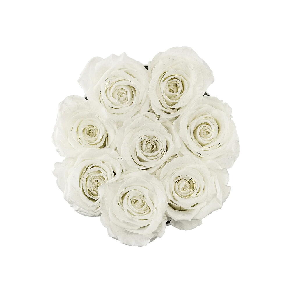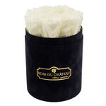 Everlasting roses are living flowers that retain their color and shape for a minimum of 2 years. You can be sure that this stylish set will dazzle significantly longer than a traditional bouquet. White roses together with a black, flocked round flowerbox make an ideal set for a casual gift for colleagues, for a wedding, or for decorating modern interiors. They will certainly please the eye for a long time and beautify the place where they are placed. The box's flocked material adds elegance and uniqueness. The white color of the flower expresses respect, symbolizes honor and peace. Like cream-colored flowers, they signify spiritual love, humility, innocence, purity, and secrecy. Number of roses: The box holds about 7-8 roses. Box diameter: Ø 15 cm We use one of the best varieties of everlasting roses available in the world.