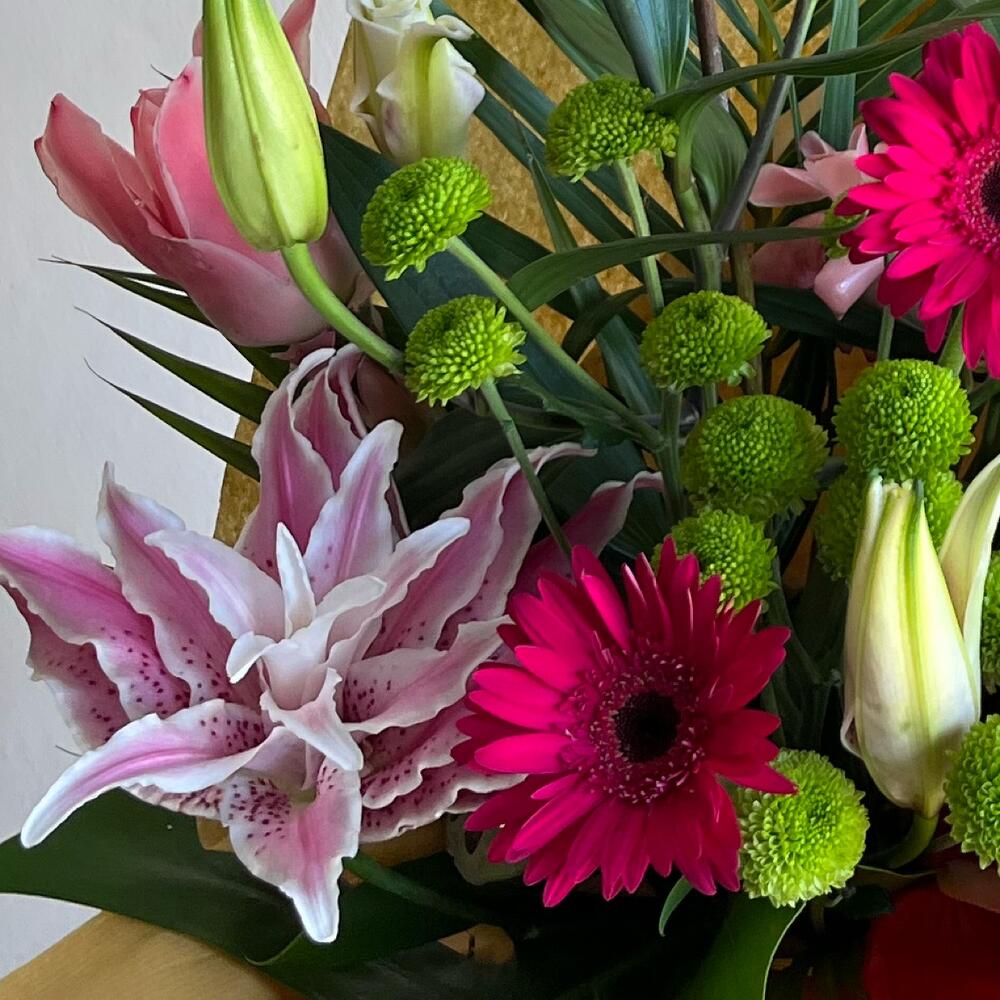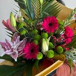 Gerbera - 6 pcs monstera - 2 pcs palm leaves - 4 pcs rose lily - 1 pcs tuberosa - 3 pcs hrisan - 4 pcs lotus box - 2 pcs